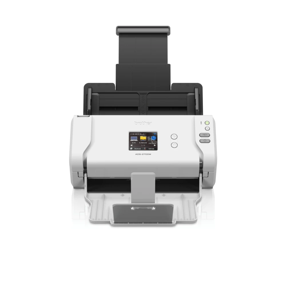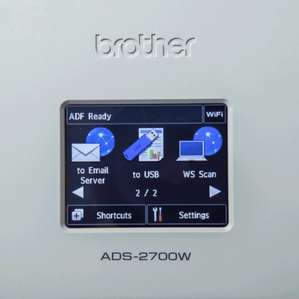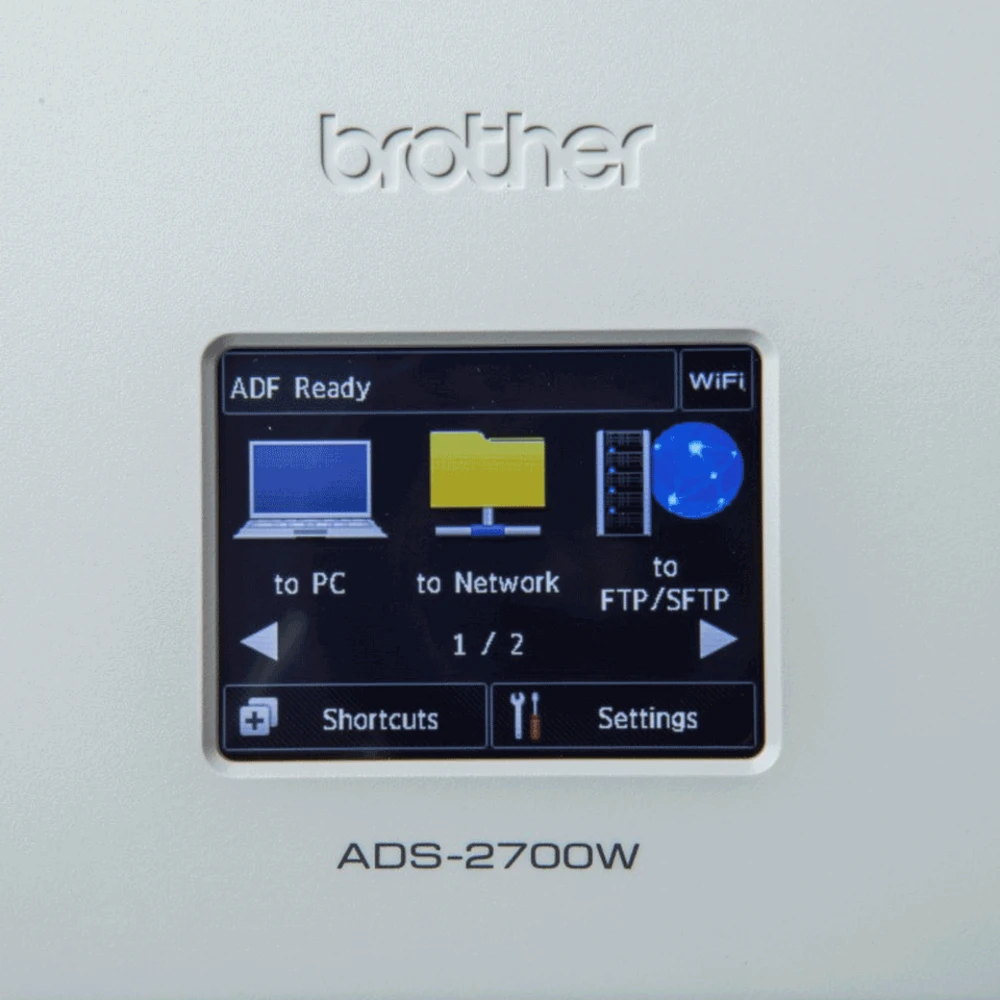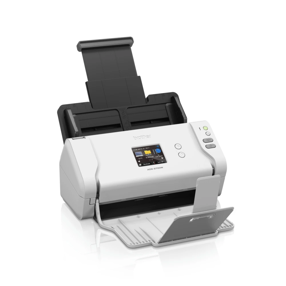 LCD (Touch), A4, 35 ppm, 1200 x 1200 dpi, 48 bit, 600 x 600 dpi, 802.11 b/g/n, 1 x LAN, 62 dB, 2.7 kg Brother ADS-2700W. Maximum scan size: 215.9 x 355.6 mm, Optical scanning resolution: 600 x 600 DPI, Enhanced scan resolution: 1200 x 1200 DPI. Scanner type: ADF scanner, Product colour: Black, White, Display: LCD. Sensor type: Dual CIS, Scan file formats: TIFF, Scan to: E-mail, E-mail Server, FTP, File, Image, OCR, USB. Auto document feeder (ADF) input capacity: 50 sheets. Maximum ISO A-series paper size: A4, Scanning media types supported: Recycled paper, Thick paper, Thin paper, ISO A-series sizes (A0...A9): A4, A5, A6 With wireless and wired network, an LCD touchscreen, Windows/Mac compatibility, scan to USB and more, the ADS-2700W is a reliable document scanner at an affordable price.