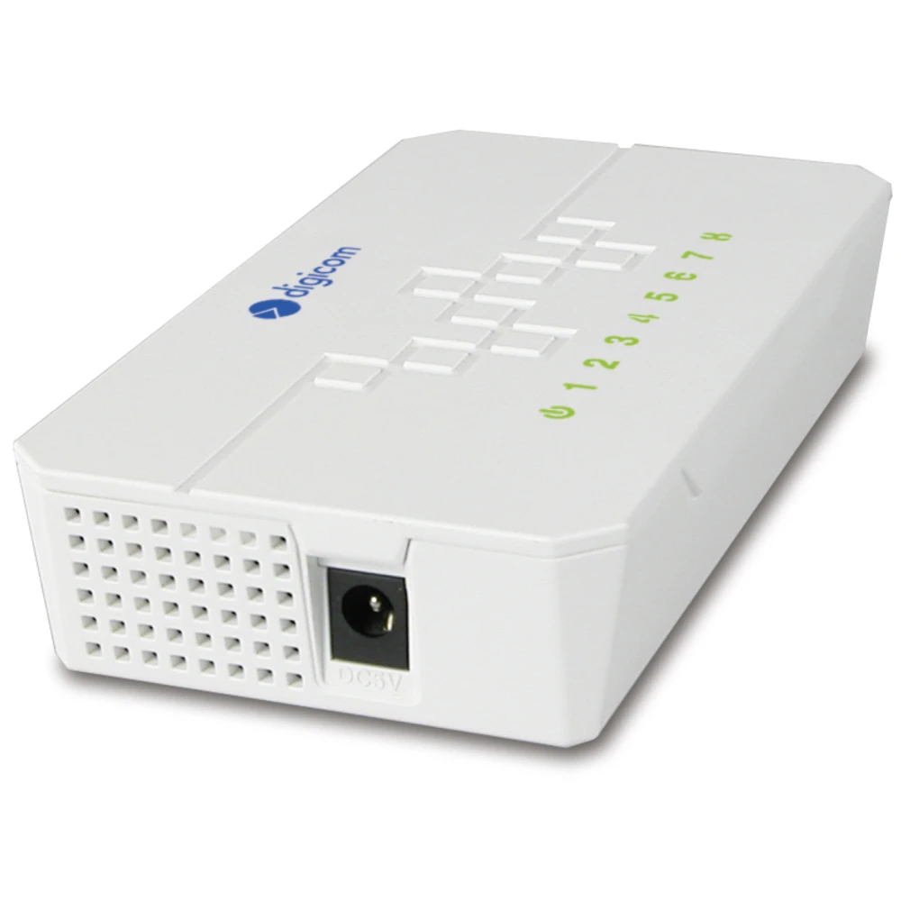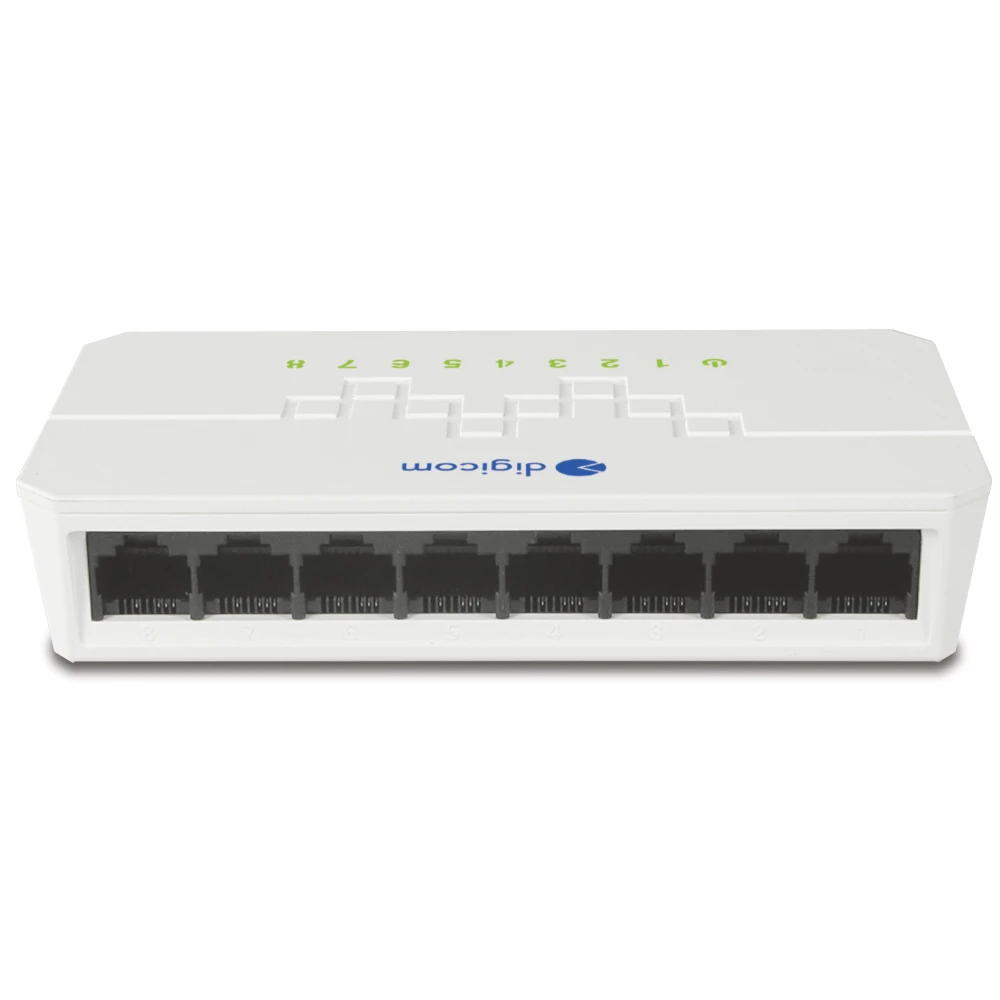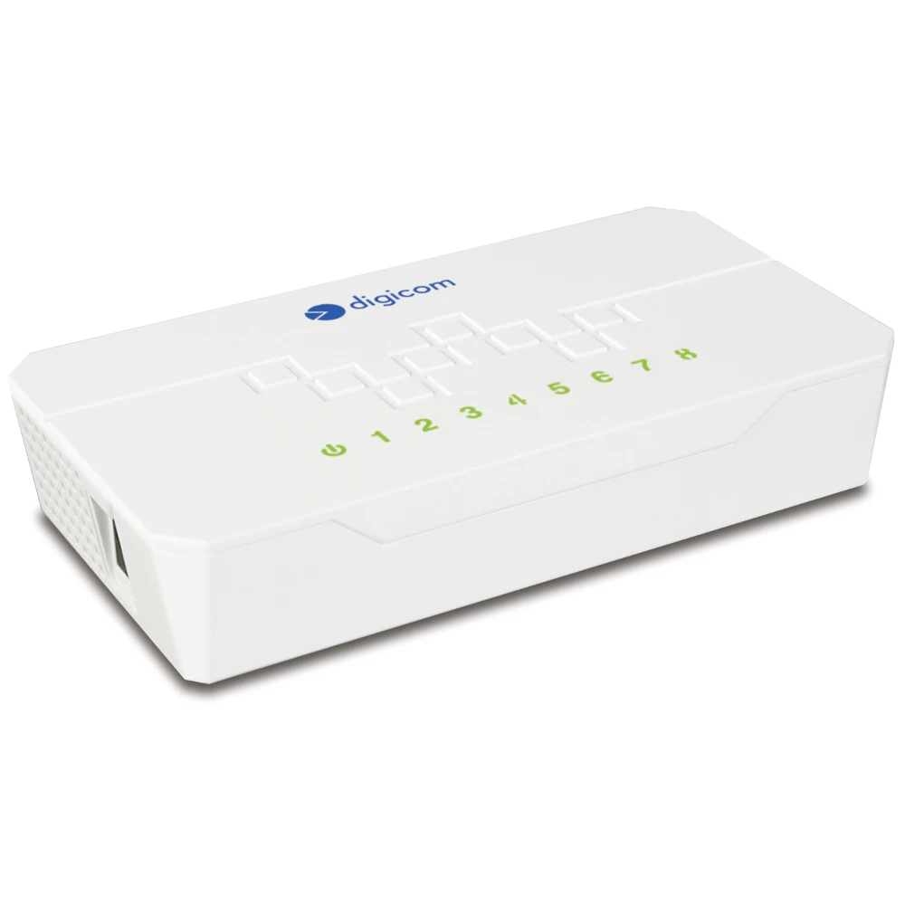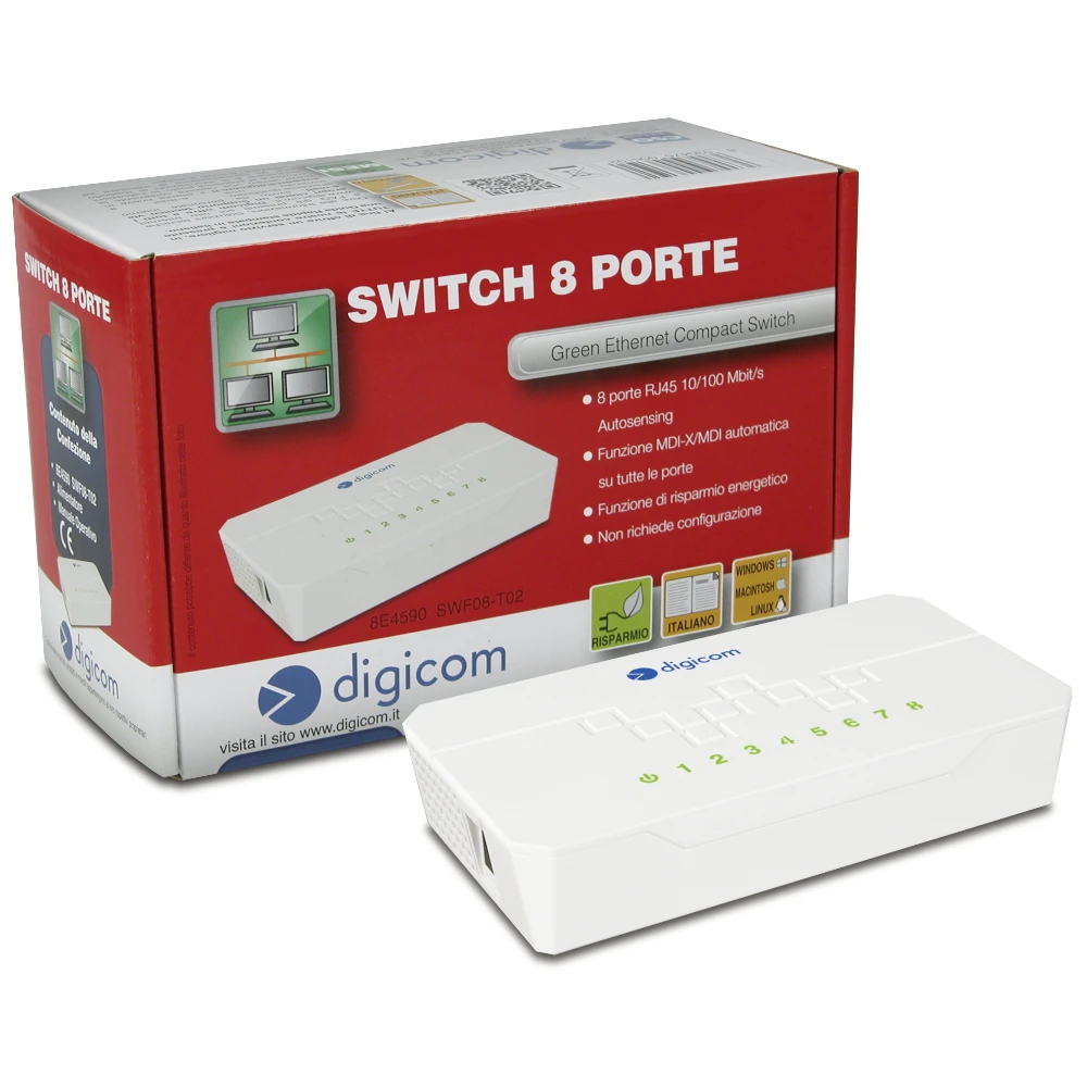 Digicom SWF08-T02. Basic switching RJ-45 Ethernet ports type: Fast Ethernet (10/100), Basic switching RJ-45 Ethernet ports quantity: 8. Full duplex. MAC address table: 1024 entries. Networking standards: IEEE 802.3, IEEE 802.3az, IEEE 802.3u, IEEE 802.3x. Power connector: DC-in jack