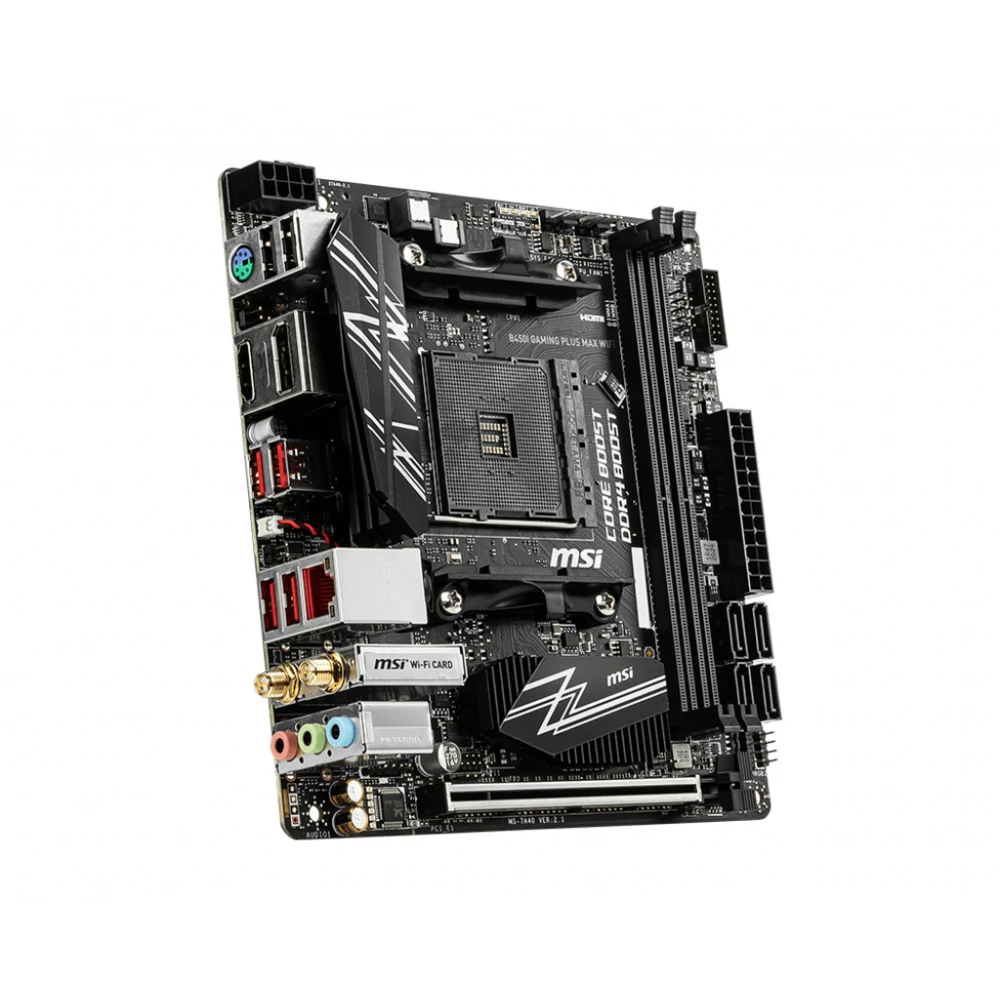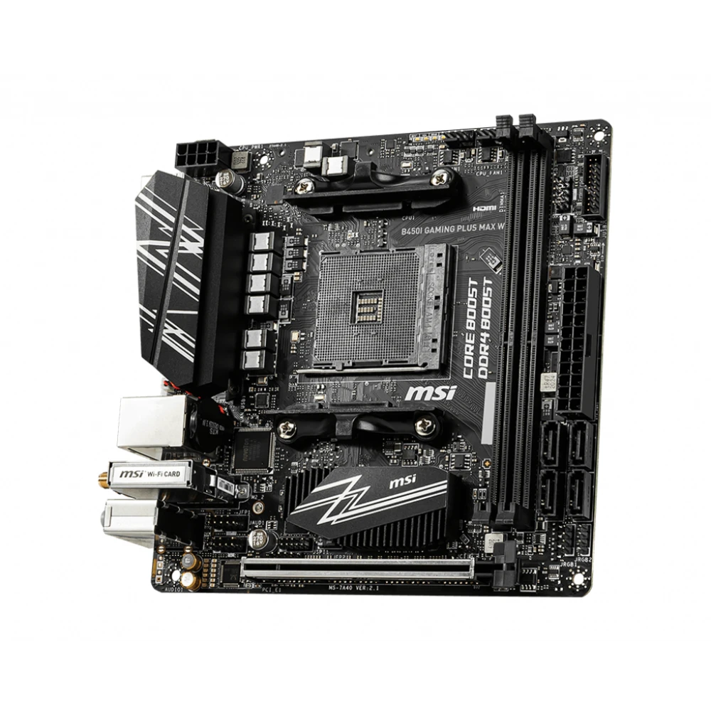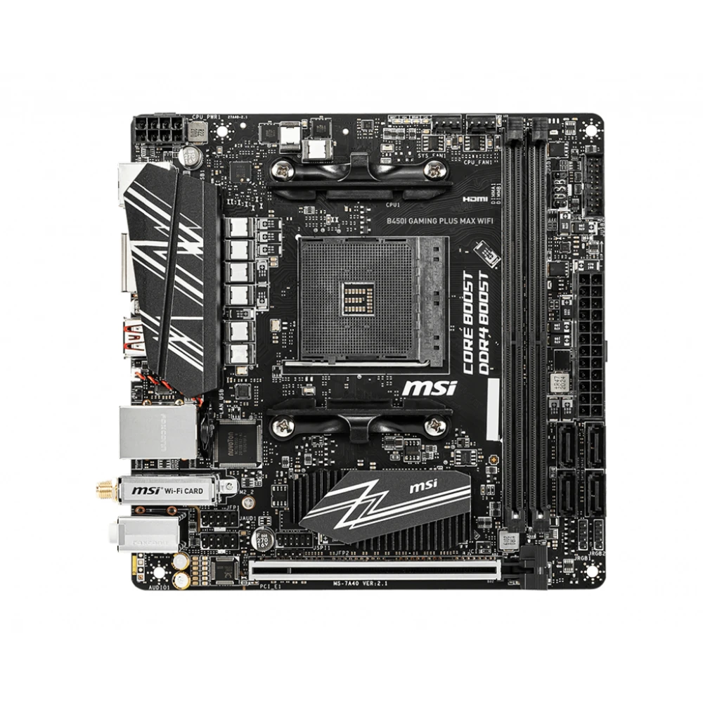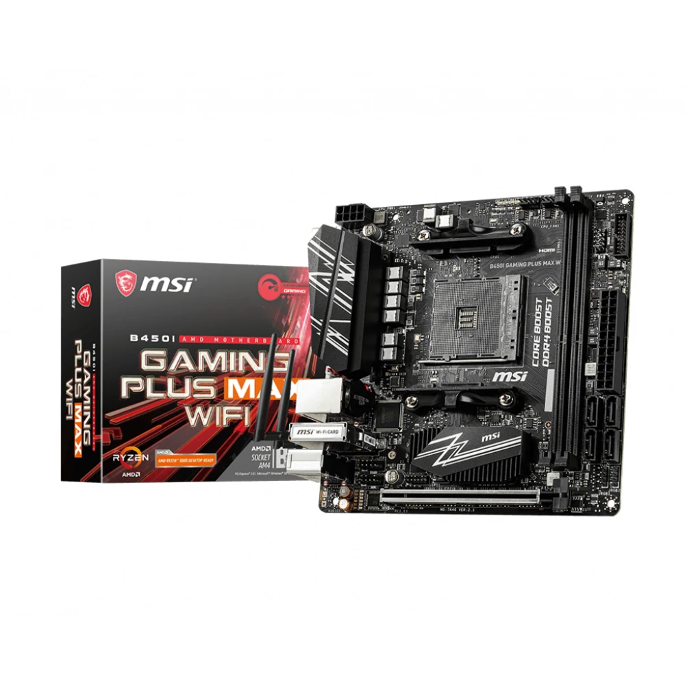 MSI B450I GAMING PLUS MAX WIFI. Processor manufacturer: AMD, Processor socket: Socket AM4, Compatible processor series: AMD Ryzen™ 3, AMD Ryzen™ 5, AMD Ryzen™ 7, 3rd Generation AMD Ryzen™ 9. Supported memory types: DDR4-SDRAM, Maximum internal memory: 64 GB, Memory slots type: DIMM. Supported storage drive interfaces: SATA III, Supported storage drive types: HDD & SSD, RAID levels: 0, 1, 10. Ethernet interface type: Gigabit Ethernet, LAN controller: Realtek 8111H, Wi-Fi standards: Wi-Fi 5 (802.11ac). Component for: PC, Motherboard form factor: mini ITX, Motherboard chipset family: AMD