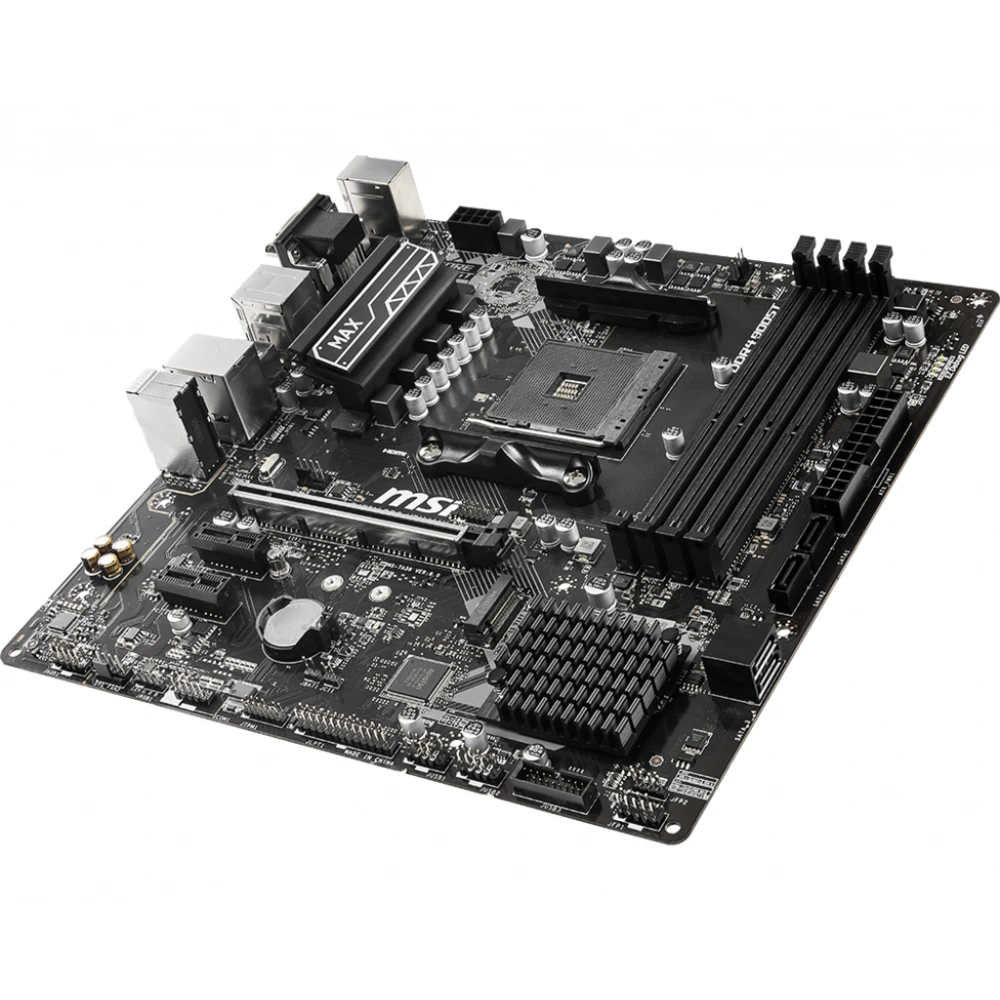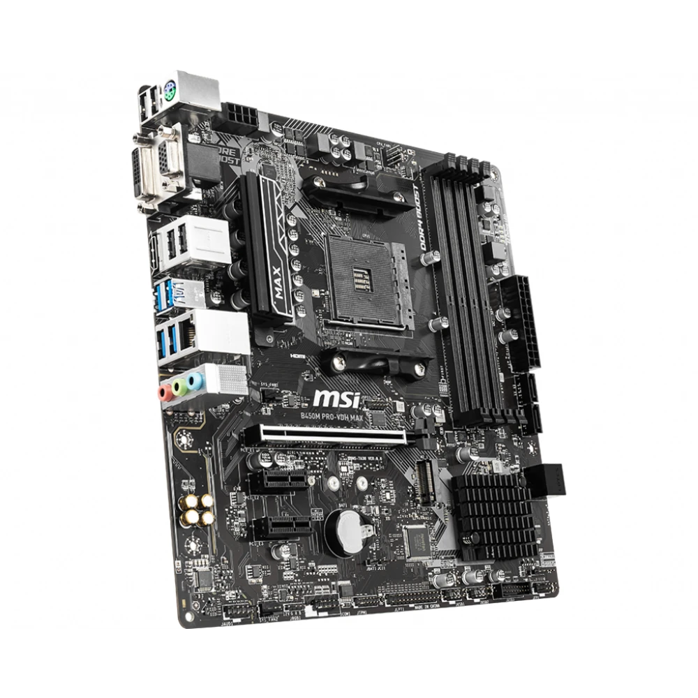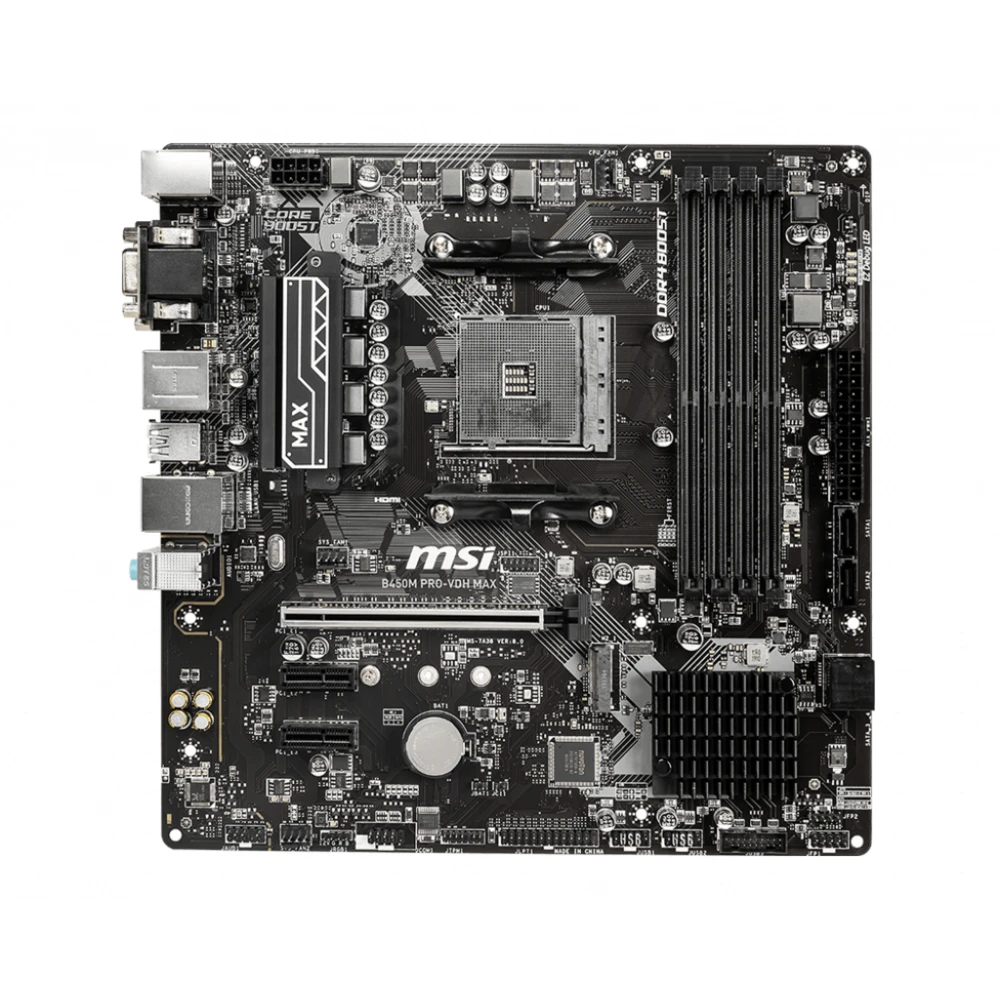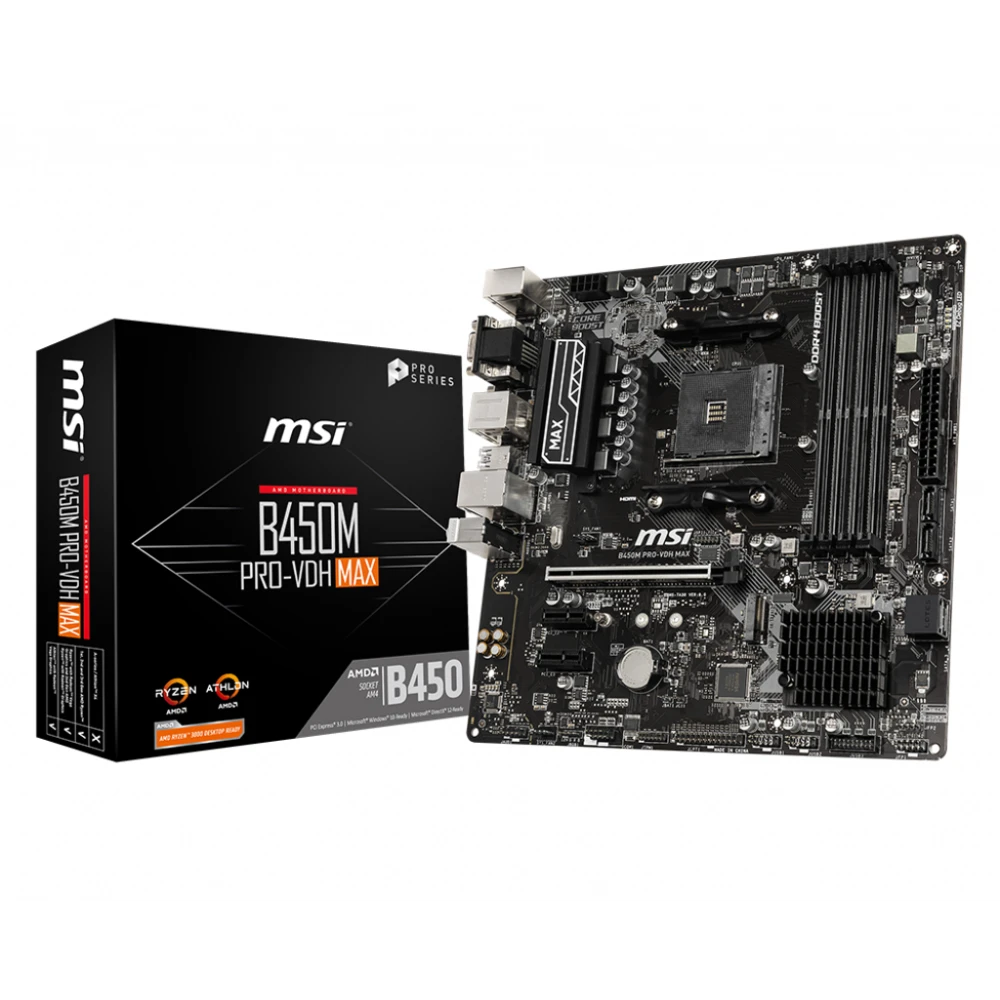 ATX, AM4, B450, 4x DDR4, 4x SATA3, M.2, 2x PCI-E x16, Gigabit Realtek 8111H, USB 2.0, USB 3.2, HDMI, DVI-D, VGA, Windows 7/10 x64 MSI B450M PRO-VDH Max. Processor manufacturer: AMD, Processor socket: Socket AM4, Compatible processor series: AMD Athlon, AMD Ryzen™ 3, 2nd Generation AMD Ryzen™ 3, 3rd Generation AMD Ryzen™ 3, AMD.... Supported memory types: DDR4-SDRAM, Maximum internal memory: 64 GB, Memory slots type: DIMM. Supported storage drive interfaces: SATA III, RAID levels: 0, 1, 10. Ethernet interface type: Gigabit Ethernet, LAN controller: Realtek 8111H. Component for: PC, Motherboard form factor: micro ATX, Motherboard chipset family: AMD BUSINESS ELEGANCE