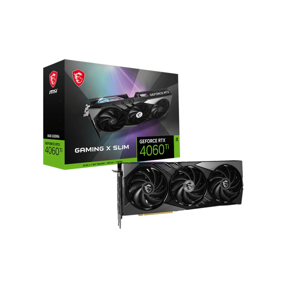 MSI GAMING GeForce RTX 4060 Ti X SLIM 8G. Graphics processor family: NVIDIA, Graphics processor: GeForce RTX 4060 Ti, Processor frequency: 2685 MHz. Discrete graphics card memory: 8 GB, Graphics card memory type: GDDR6, Memory bus: 128 bit. Maximum resolution: 7680 x 4320 pixels. DirectX version: 12 Ultimate, OpenGL version: 4.6. Interface type: PCI Express 4.0. Cooling type: Active, Number of fans: 3 fan(s)