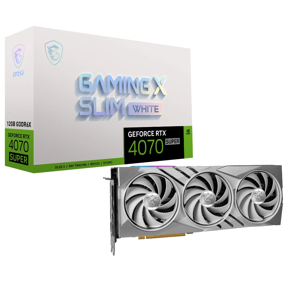 NVIDIA GeForce RTX 4070 SUPER, 2655MHz, 12GB GDDR6X, 192 bit, PCI Express 4.0, 1 x HDMI (1.2a), 3 x DP (1.4a), CUDA, DirectX 12 Ultimate, OpenGL 4.6, 245W MSI GAMING GeForce RTX 4070 SUPER 12G X SLIM WHITE. Graphics processor family: NVIDIA, Graphics processor: GeForce RTX 4070 SUPER, Processor frequency: 2655 MHz. Discrete graphics card memory: 12 GB, Graphics card memory type: GDDR6X, Memory bus: 192 bit. Maximum resolution: 7680 x 4320 pixels. DirectX version: 12 Ultimate, OpenGL version: 4.6. Interface type: PCI Express 4.0. Cooling type: Active, Number of fans: 3 fan(s) Gaming Unbound