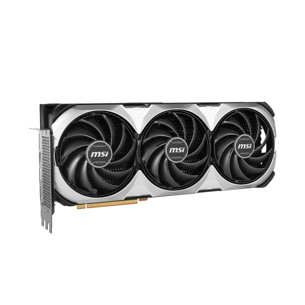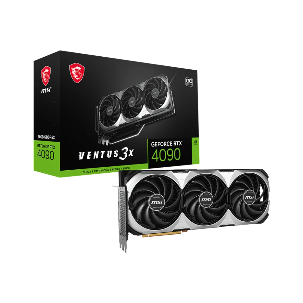 NVIDIA GeForce RTX 4090, 2565MHz, 24GB GDDR6X, 384 bit, PCI Express 4.0, 1 x HDMI (2.1a), 3 x DP (1.4a), CUDA, DirectX 12 Ultimate, OpenGL 4.6, 450W MSI VENTUS GeForce RTX 4090 3X E 24G OC. Graphics processor family: NVIDIA, Graphics processor: GeForce RTX 4090, Processor frequency: 2565 MHz. Discrete graphics card memory: 24 GB, Graphics card memory type: GDDR6X, Memory bus: 384 bit. Maximum resolution: 7680 x 4320 pixels. DirectX version: 12 Ultimate, OpenGL version: 4.6. Interface type: PCI Express 4.0. Cooling type: Active, Number of fans: 3 fan(s) TAKE THE ESSENTIALS