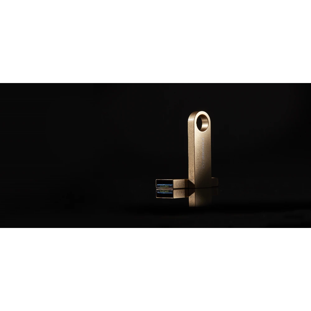 An all-metal gold casing that's portable enough to fit in your pocket, backpack or on your keyring loop.
