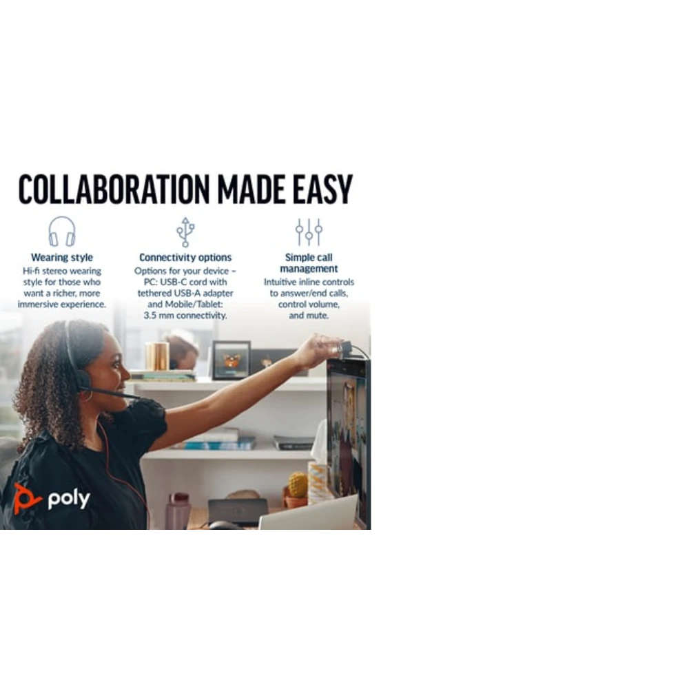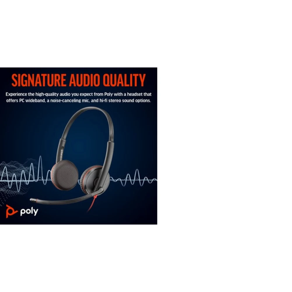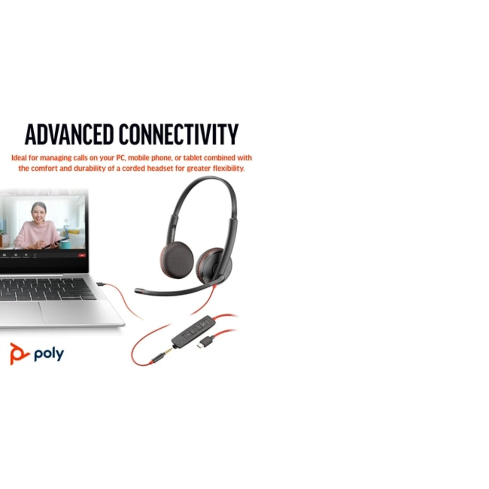 POLY Blackwire 3225 Stereo USB-C Headset +3.5mm Plug +USB-C/A Adapter (Bulk). Product type: Headset. Connectivity technology: Wired. Recommended usage: Office/Call center. Headphone frequency: 20 - 20000 Hz. Weight: 92 g. Product colour: Black