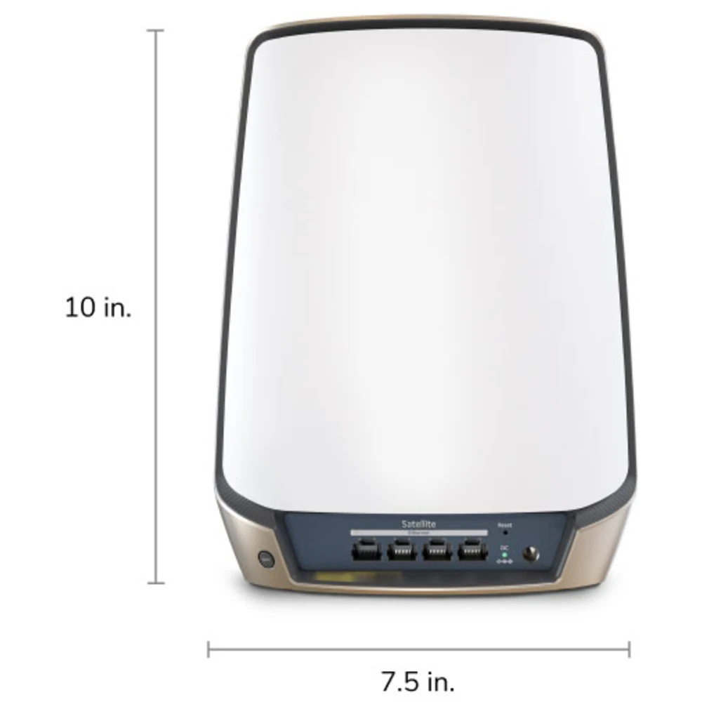 NETGEAR Orbi 860 AX6000 WiFi Satellite. Product colour: White, Antenna type: Internal, Product type: Mesh satellite. Wi-Fi band: Tri-band (2.4 GHz / 5 GHz / 5 GHz), Top Wi-Fi standard: Wi-Fi 6 (802.11ax), Wi-Fi standards: Wi-Fi 6 (802.11ax). Processor frequency: 2.2 GHz, Internal memory: 1000 MB, Flash memory: 512 MB. AC adapter output voltage: 19 V, AC adapter output current: 3.16 A. Width: 190.5 mm, Depth: 71.1 mm, Height: 254 mm
