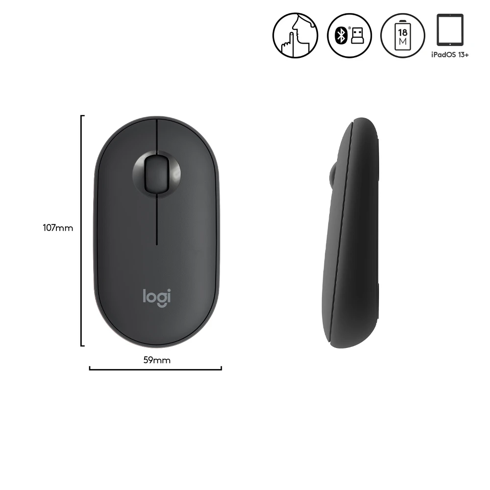Logitech Pebble M350 Wireless Mouse. Form factor: Ambidextrous. Movement detection technology: Optical, Device interface: RF Wireless + Bluetooth, Movement resolution: 1000 DPI, Buttons type: Pressed buttons, Buttons quantity: 3, Scroll type: Wheel. Power source: Batteries. Product colour: Graphite