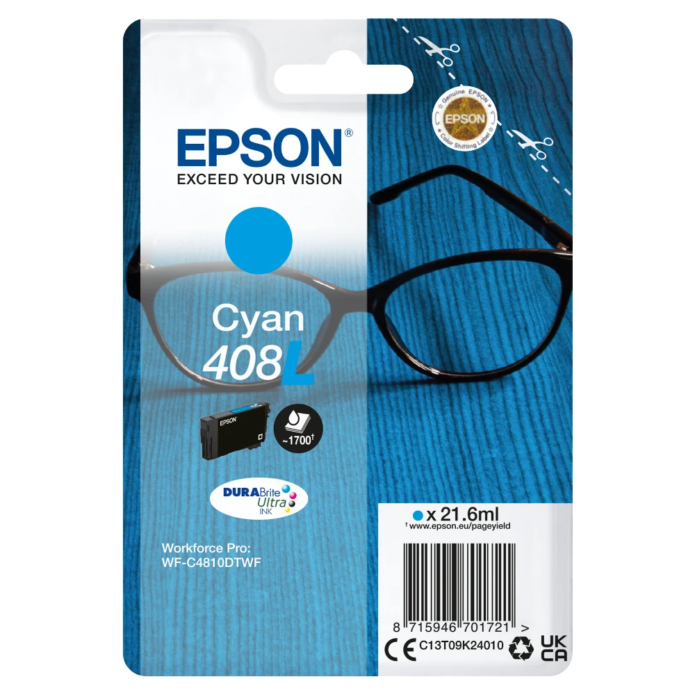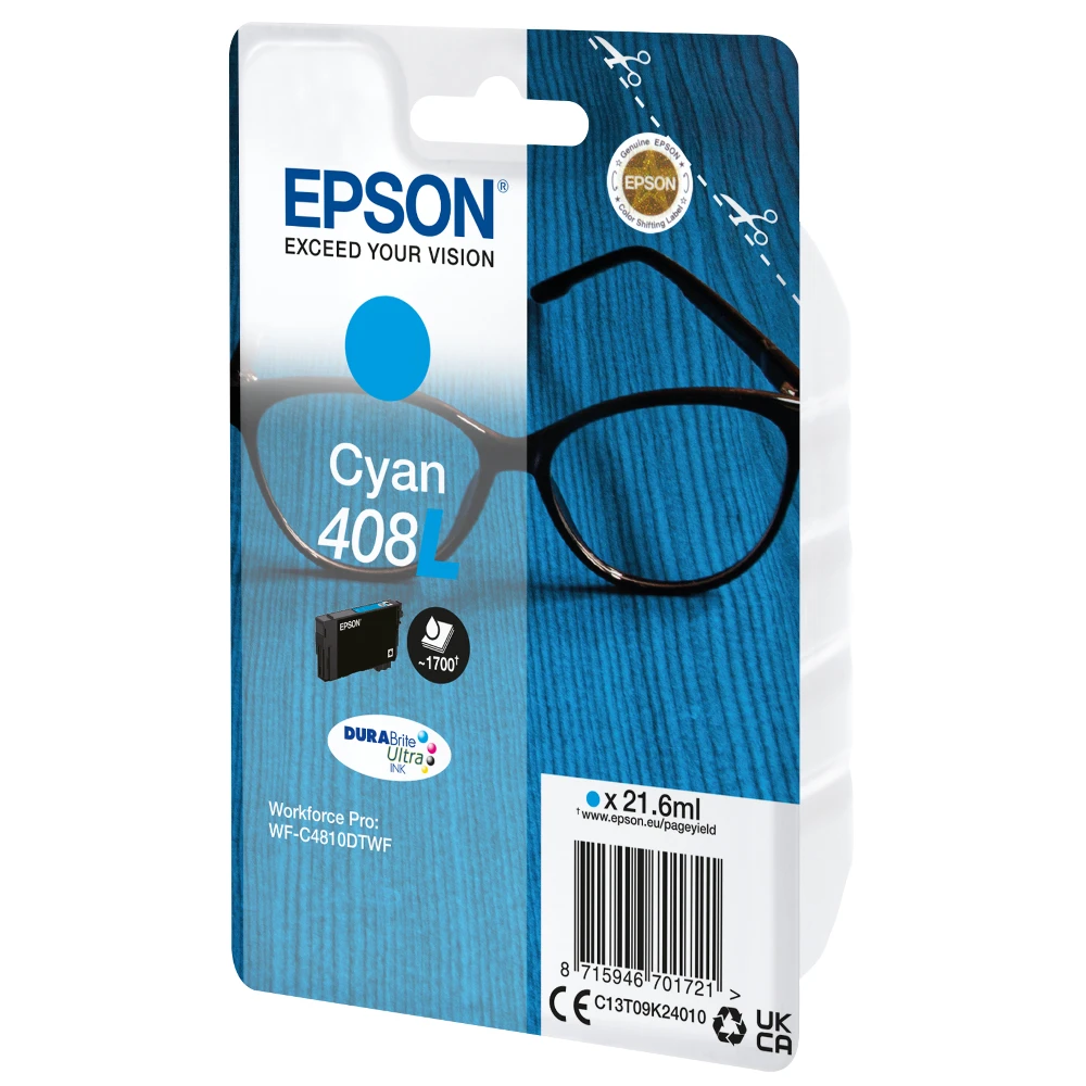 Epson 408L DURABrite Ultra. Colour ink type: Pigment-based ink, Cartridge capacity: High (XL) Yield, Colour ink volume: 21.6 ml, Printing colours: Cyan, Quantity per pack: 1 pc(s)