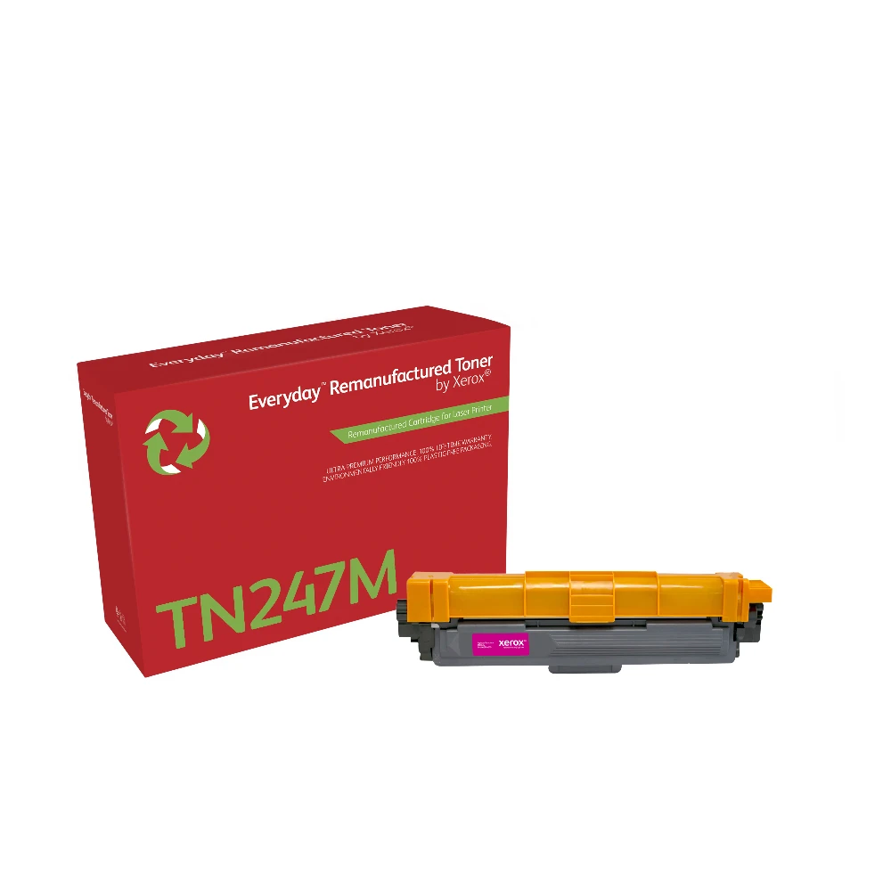 Everyday™ Magenta Remanufactured Toner by Xerox compatible with Brother TN247M, High capacity Everyday™ Magenta Remanufactured Toner by compatible with Brother TN247M, High capacity. Colour toner page yield: 2300 pages, Black toner page yield: 2300 pages, Printing colours: Magenta, Quantity per pack: 1 pc(s) Being environmentally responsible is simply the best way to do business, because it positively impacts the health of our planet, your company and your people. Everyday Remanufactured Toner by Xerox has the lowest carbon footprint than any single-use toner cartridge. Because you shouldn't have to choose between doing your part to reduce your eco-impact and your toner costs. And compatibility with the most popular printer brands means you can enjoy benchmark Xerox quality and stewardship no matter what kind of printer you have.