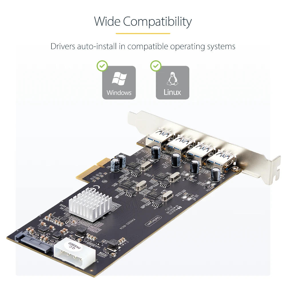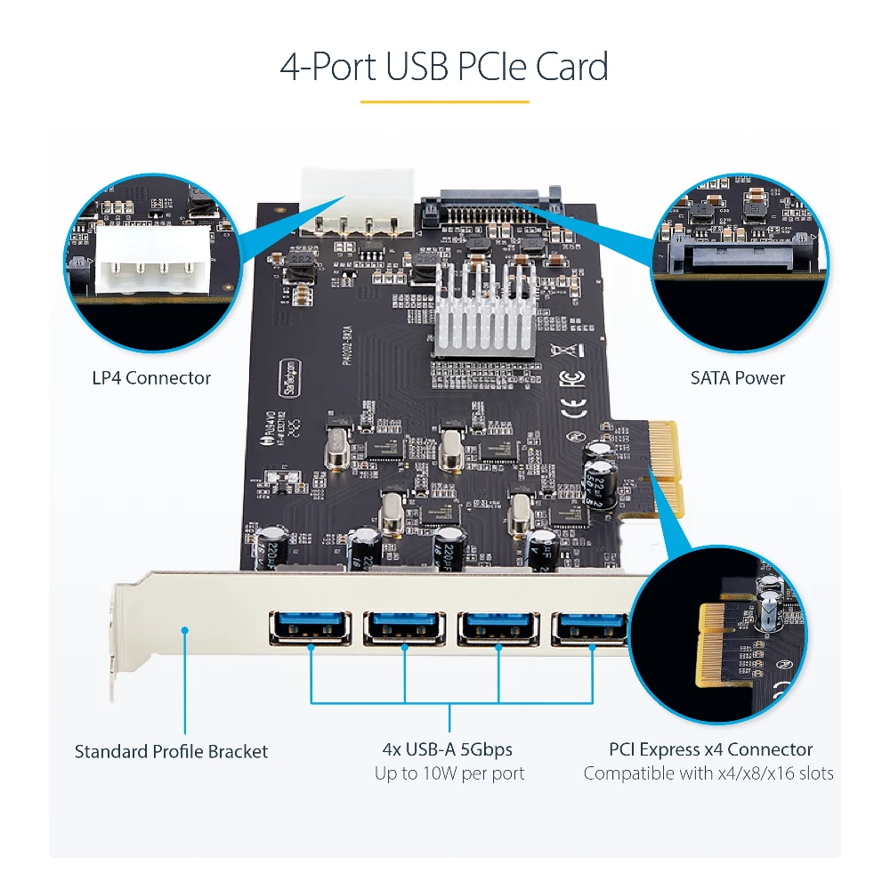 Upgrade or expand a desktop computer/server's USB connectivity by adding four external USB Type-A ports - USB card features 4x independent controllers which allow for full 5Gbps performance per port simultaneously - USB PCIe expansion card with internal SATA and LP4 power; 5V 2A (10W) per port - USB expansion card works with Windows/macOS/Linux; Compatible with all hardware platforms including Intel/AMD/Apple Silicon - PCI Express 2.0 x4; Standard profile bracket pre-installed