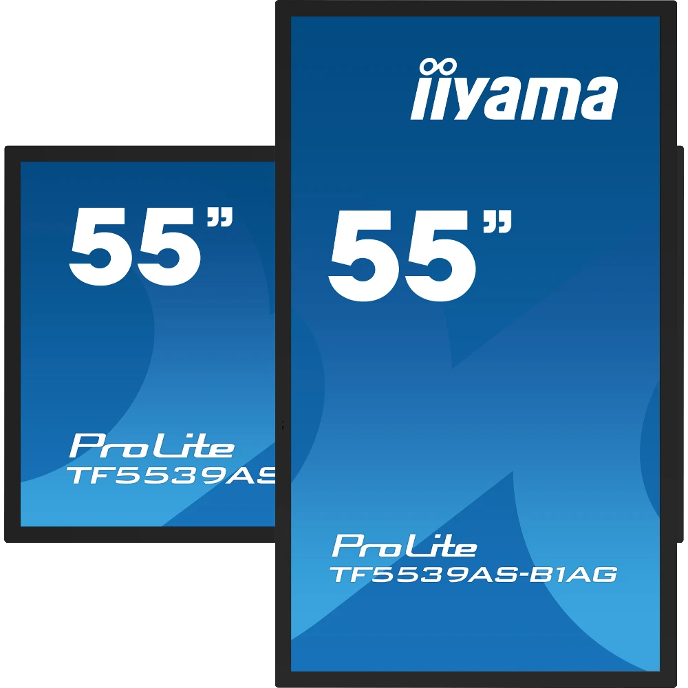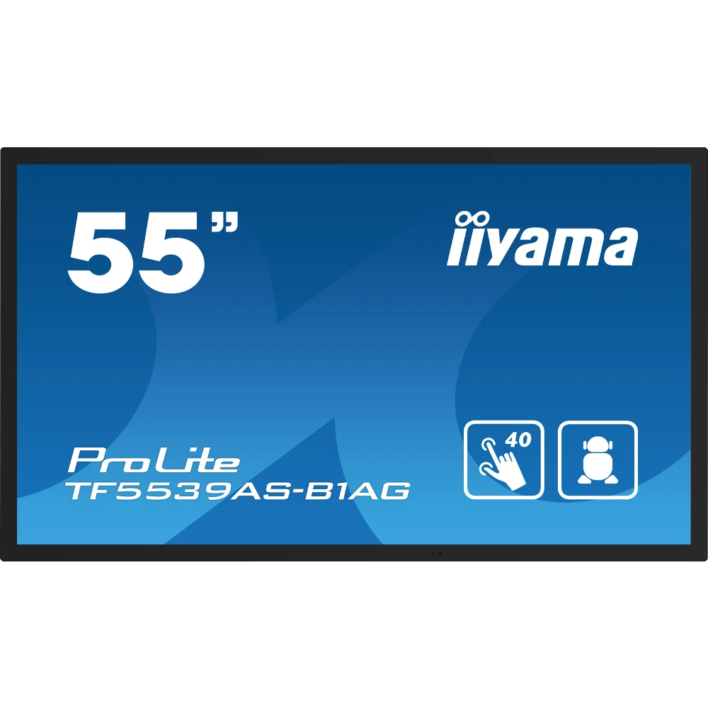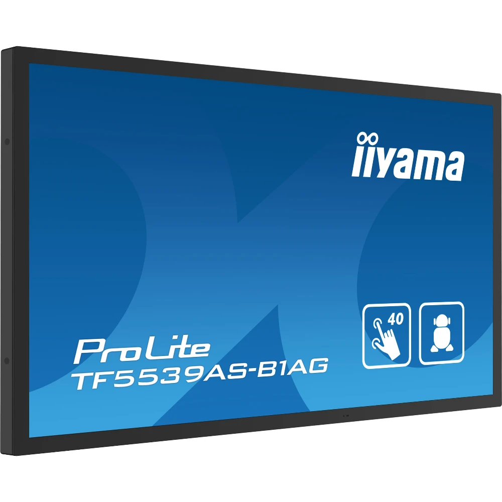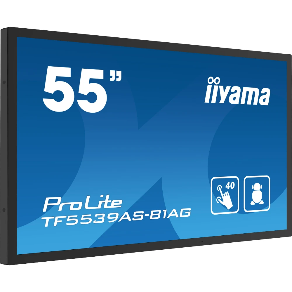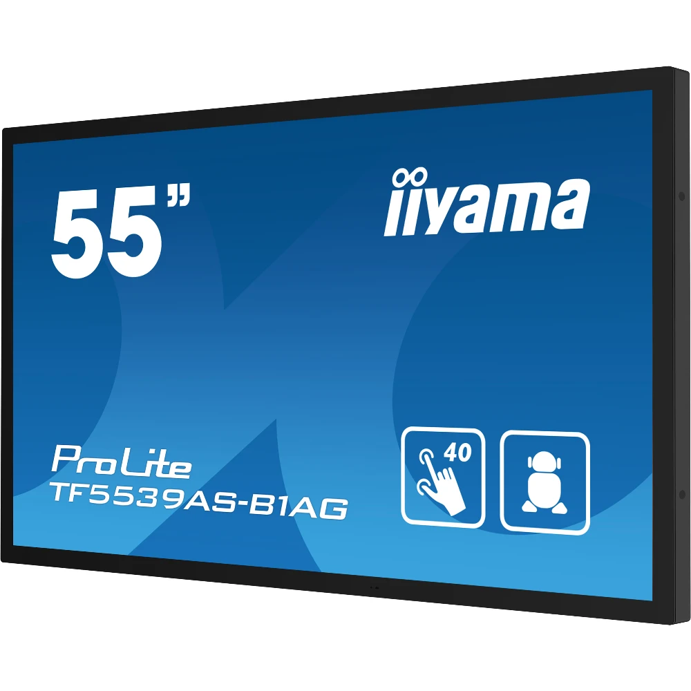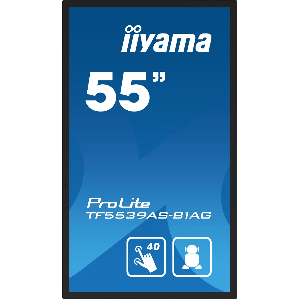 iiyama TF5539AS-B1AG. Product design: Digital signage flat panel. Display diagonal: 138.7 cm (54.6"), Display technology: LED, Display resolution: 3840 x 2160 pixels, Display brightness: 500 cd/m², HD type: 4K Ultra HD, Touchscreen. Operating hours (hours/days): 24/7. Operating system installed: Android. Product colour: Black