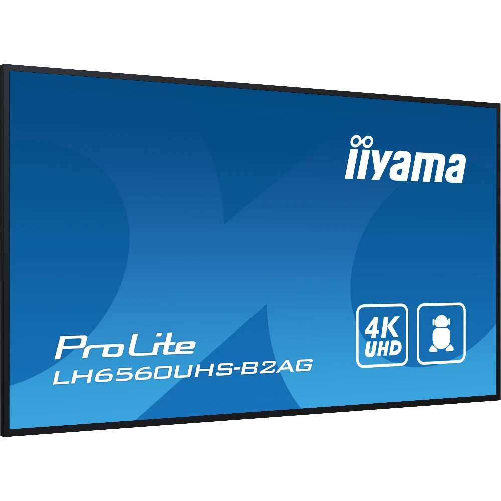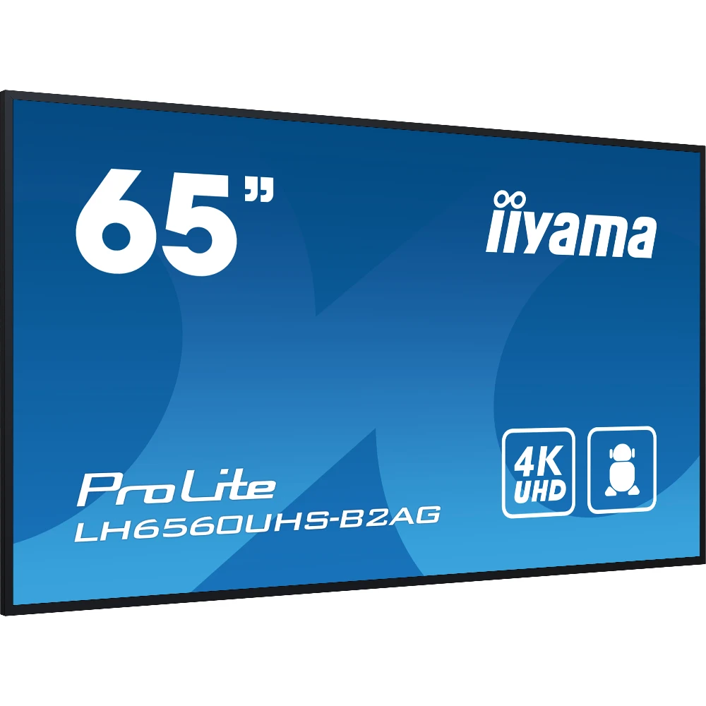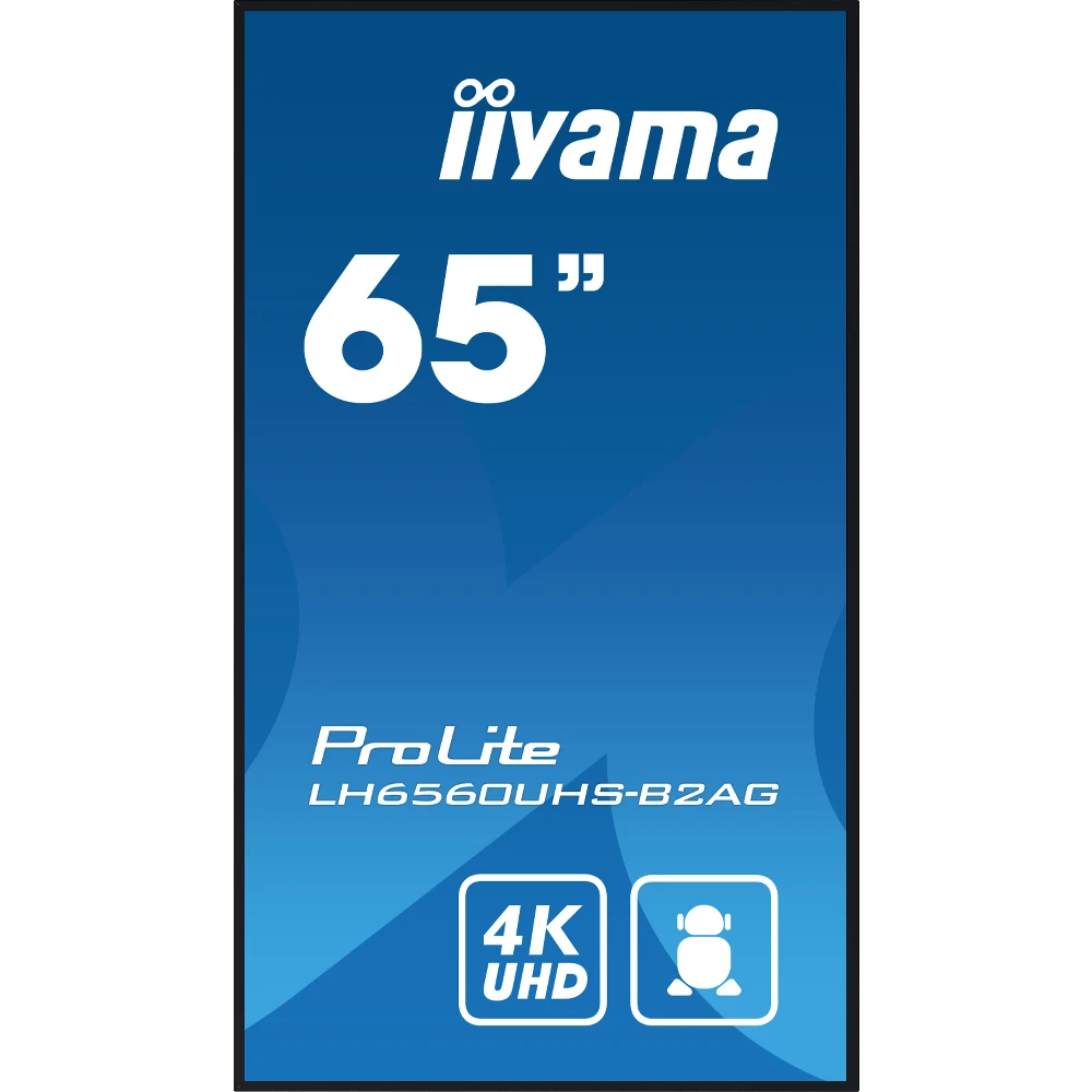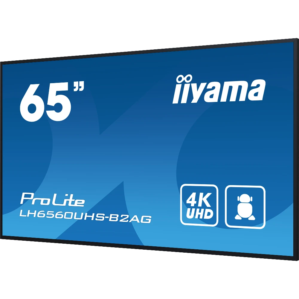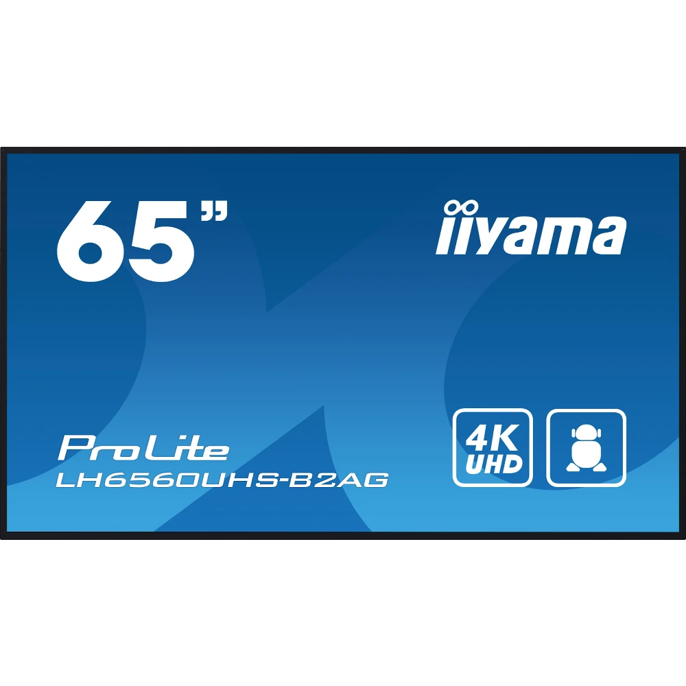 iiyama LH6560UHS-B2AG. Product design: Digital A-board. Display diagonal: 165.1 cm (65"), Display technology: LED, Display resolution: 3840 x 2160 pixels, Display brightness: 500 cd/m², HD type: 4K Ultra HD. Wi-Fi. Operating hours (hours/days): 24/7. Operating system installed: Android 11. Product colour: Black
