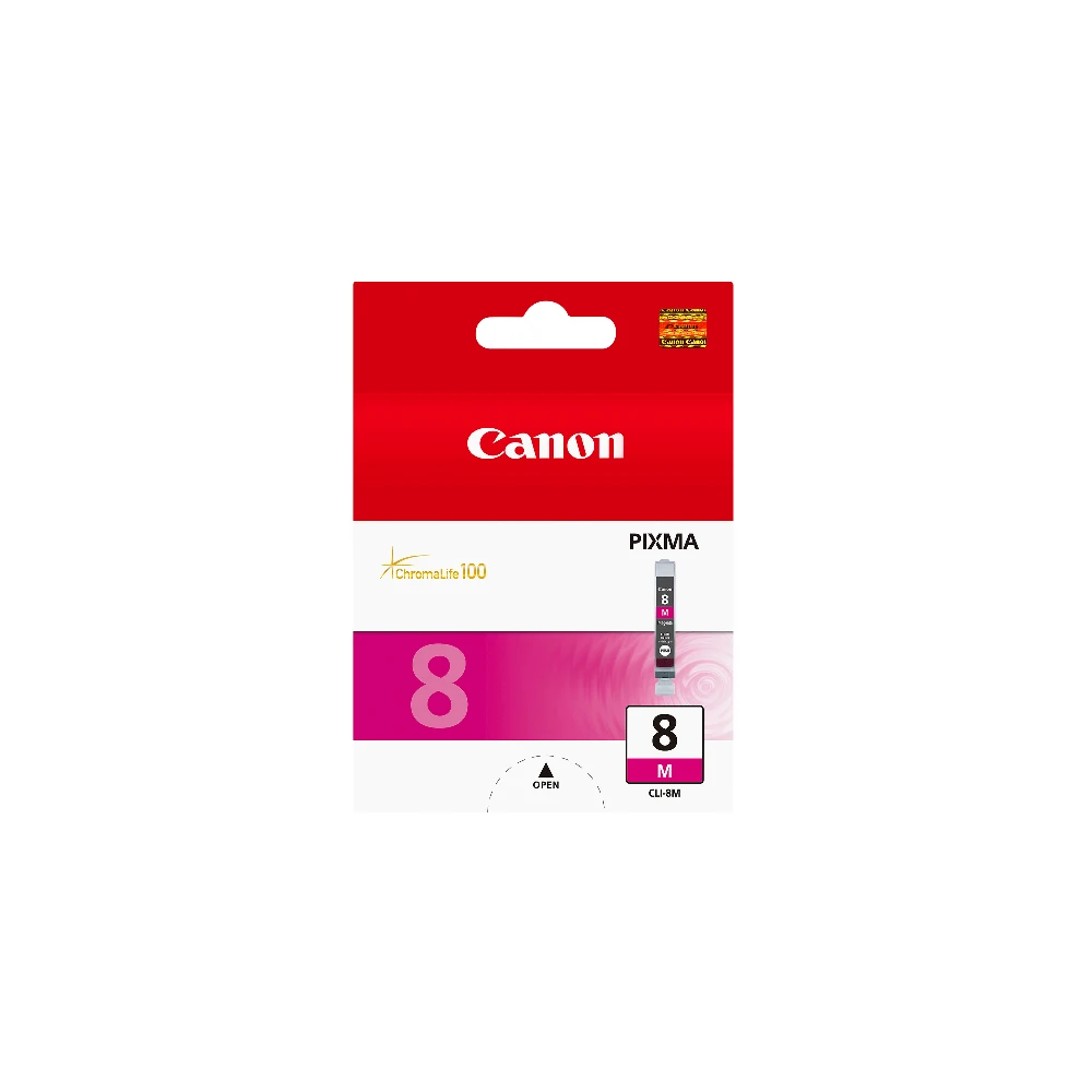 CLI-8M Magenta Ink Cartridge Canon CLI-8M Magenta Ink Cartridge. Colour ink type: Pigment-based ink, Colour ink page yield: 565 pages, Printing colours: Magenta, Quantity per pack: 1 pc(s) The ChromaLife100 dye-based ink range delivers stunning quality and vibrant photos in colour and monochrome. The 13ml magenta ink tank allows you to print up to 565 photos in 10x15cm or 59 in A3+ size at ISO/IEC 24711† standard.