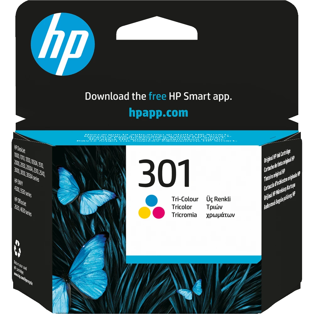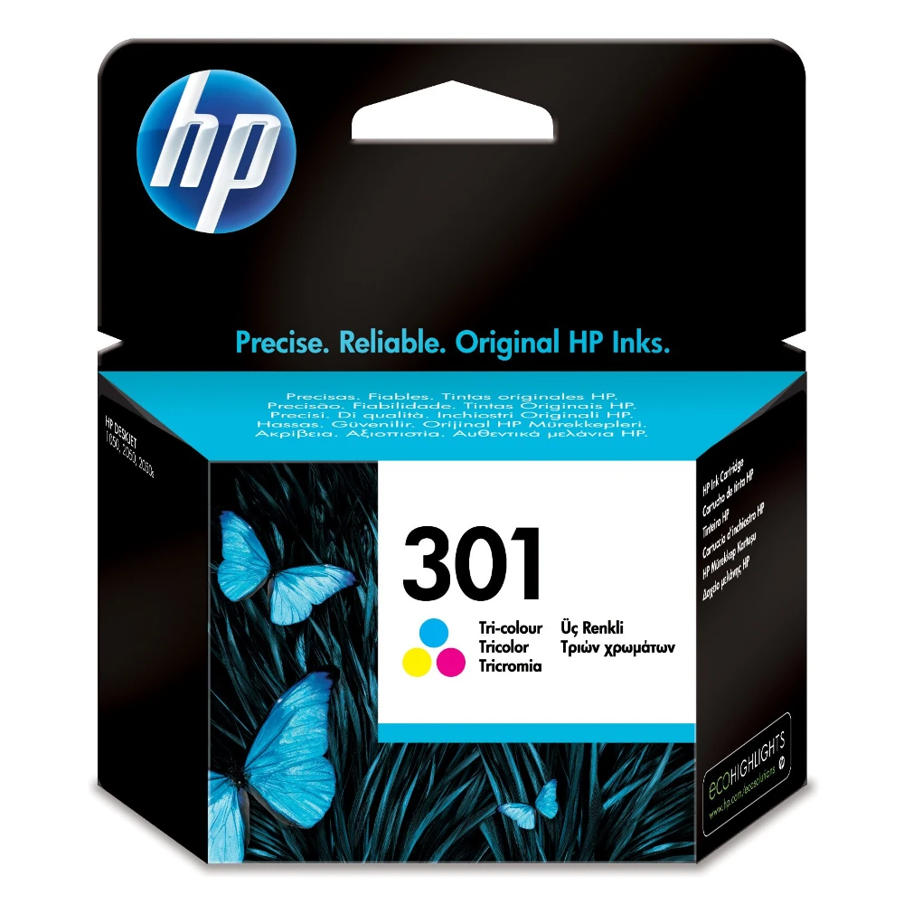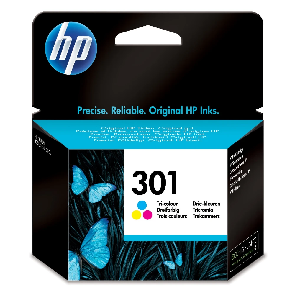 HP 301 Tri-color Original Ink Cartridge. Colour ink type: Dye-based ink, Cartridge capacity: Standard Yield, Colour ink page yield: 150 pages, Colour ink volume: 3 ml, Printing colours: Cyan, Magenta, Yellow, Quantity per pack: 1 pc(s)