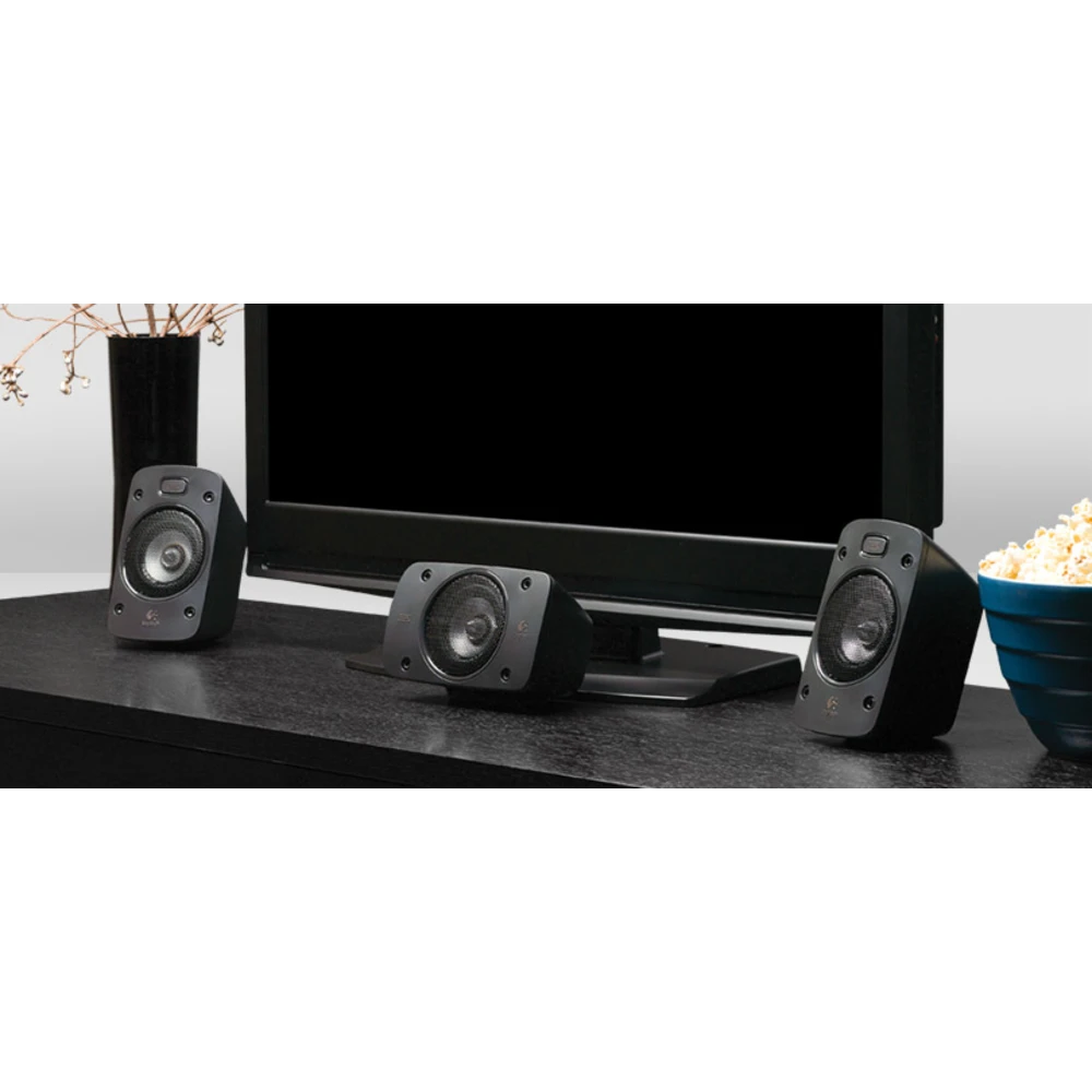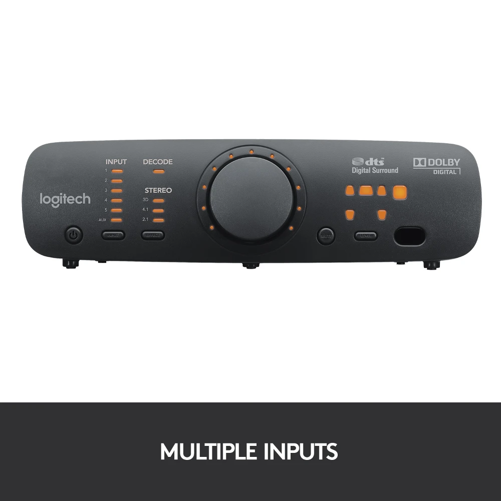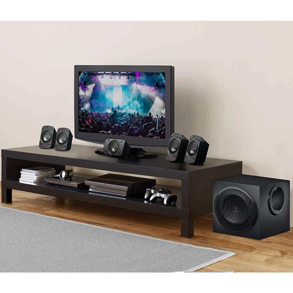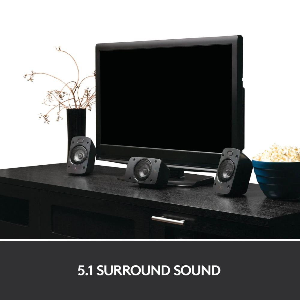 Logitech® Surround Sound Speakers Z906-hear every detail, all around you, in theater-quality sound. 500 watts (RMS) of thunderous audio turns any night into opening night. THX® Certification gives you quality you can count on, while onboard 5.1 digital decoding immerses you in your favorite movies as you hear every detail of Dolby® Digital or DTSTM encoded soundtracks in surround sound-from the roar of the crowd to the footsteps right behind you. You can connect up to six components simultaneously, including your TV, Blu-ray™/DVD, player, DVR, Xbox 360®, PLAYSTATION®3, Wii®, iPod® and stereo. With its easy-to-read display and easy-to-stack design, the control console fits right in with the home-entertainment setup in your living room. And a wireless remote lets you control your listening experience without ever getting off the couch.