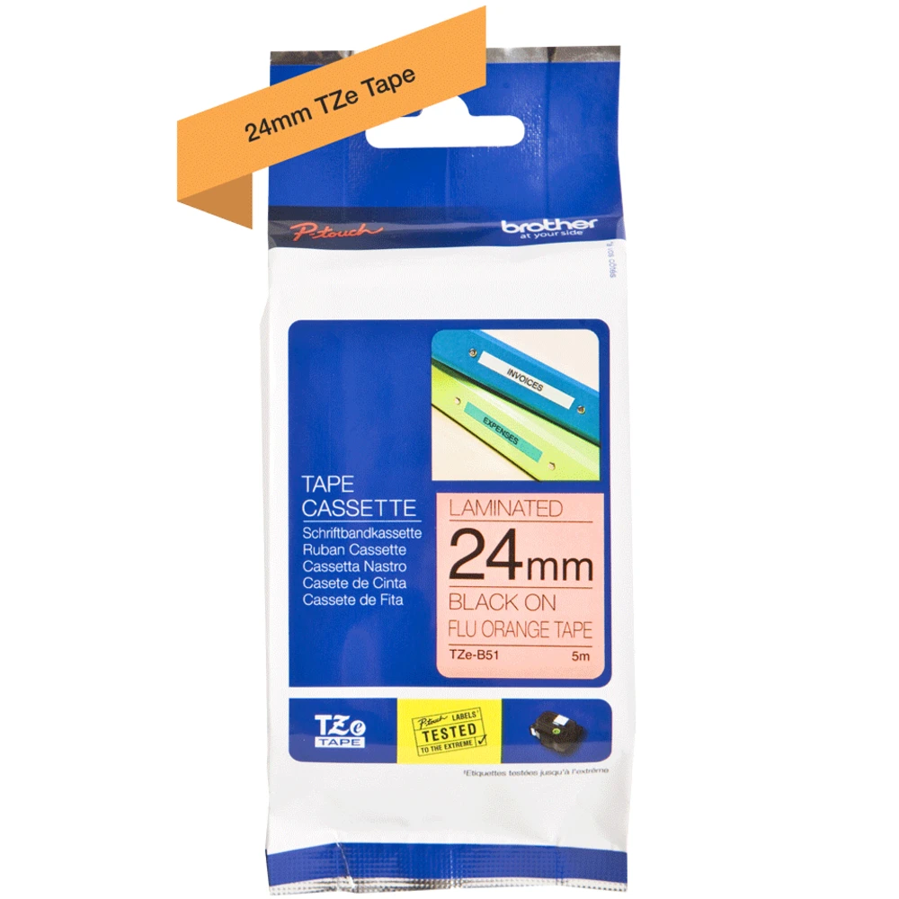 Brother Laminated tape. Label colour: Black on fluorescent orange, Tape type: TZe, Product colour: Grey. Tape width: 2.4 cm, Tape length: 5 m, Width: 28 mm. Tape size: 2.4 cm
