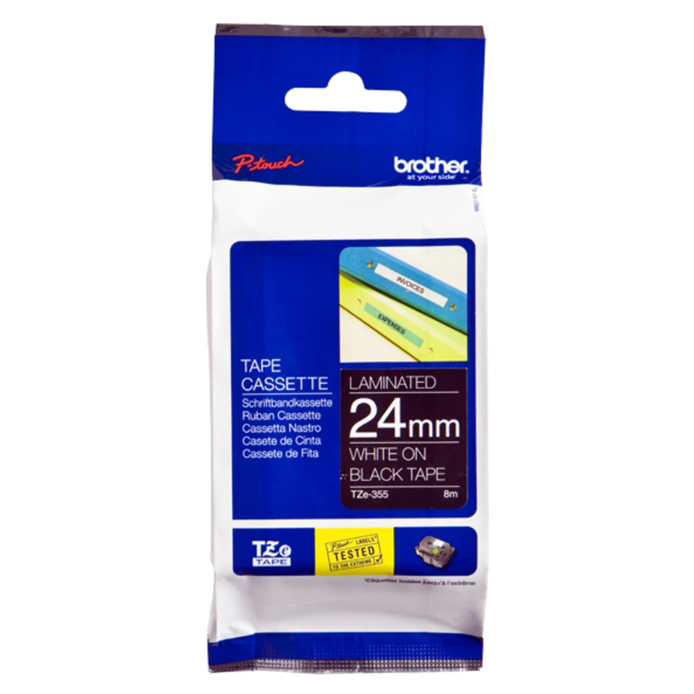 Brother Laminated tape 24mm. Label colour: White on black, Tape type: TZe, Print technology: Thermal transfer. Tape width: 2.4 cm, Tape length: 8 m, Width: 28 mm. Tape size: 2.4 cm