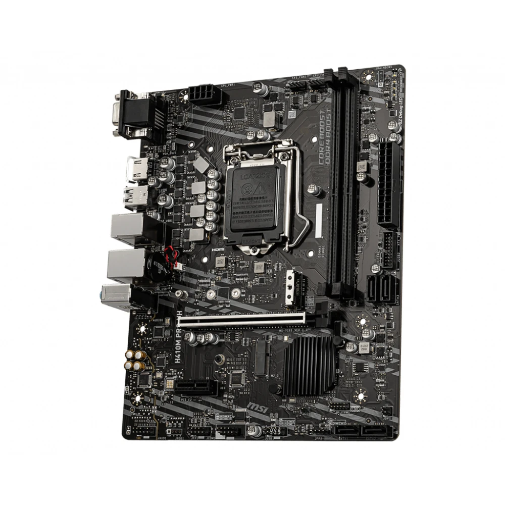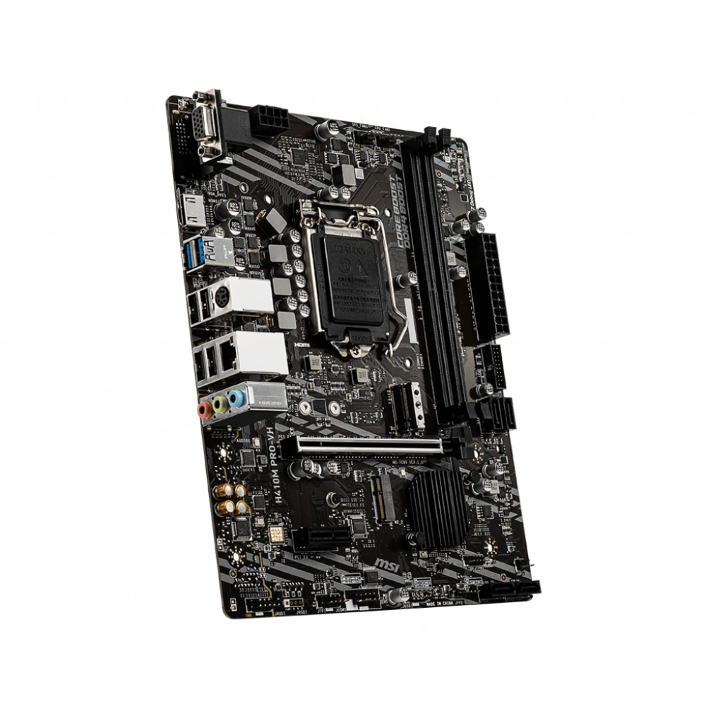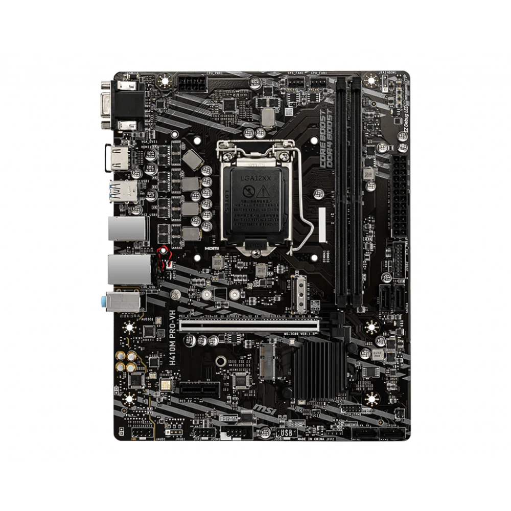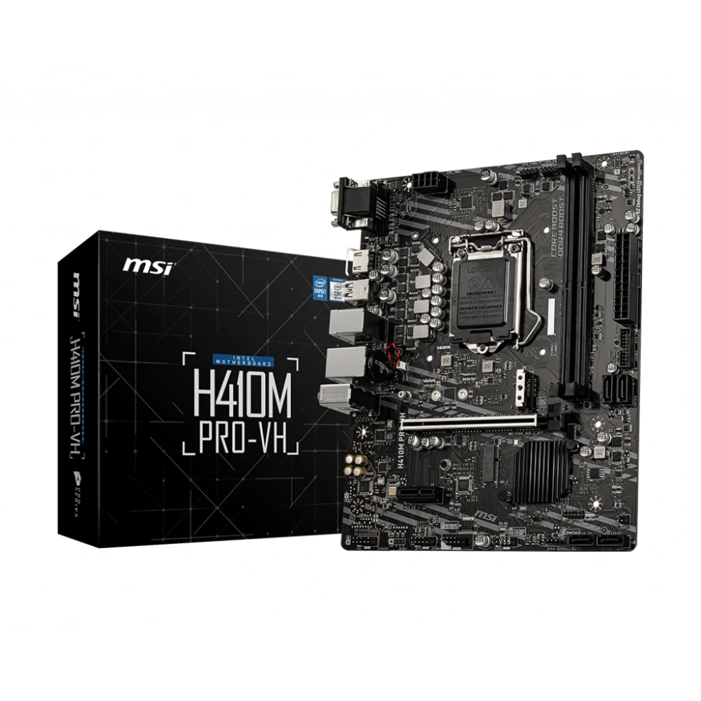 LGA1200, Intel H410, 2x DDR4, HDMI, VGA, SATA III, M.2, USB 3.2, 1G LAN, Mirco-ATX, 236x190 mm MSI H410M PRO-VH. Processor manufacturer: Intel, Processor socket: LGA 1200 (Socket H5), Compatible processor series: Intel® Celeron®, Intel® Core™ i3, Intel® Core™ i5, Intel® Core™ i7, Intel® Core™ i9, Intel® Pentium®. Supported memory types: DDR4-SDRAM, Maximum internal memory: 64 GB, Memory slots type: DIMM. Supported storage drive interfaces: SATA III, Supported storage drive types: HDD & SSD. Maximum resolution: 4096 x 2160 pixels. Ethernet interface type: Gigabit Ethernet, LAN controller: Intel® I219-V PRO series helps users work smarter by delivering an efficient and productive experience. Featuring stable functionality and high-quality assembly, PRO series motherboards provide not only optimized professional workflows but also less troubleshooting and longevity.