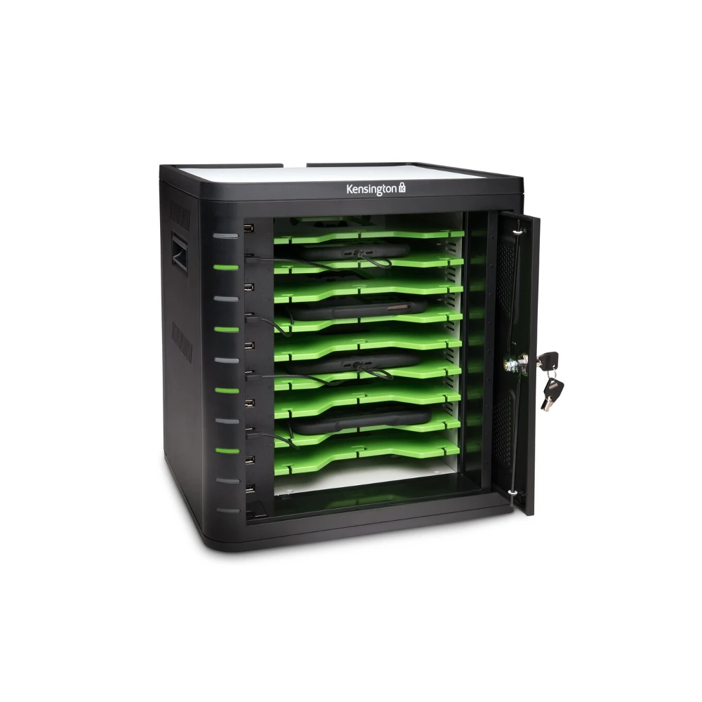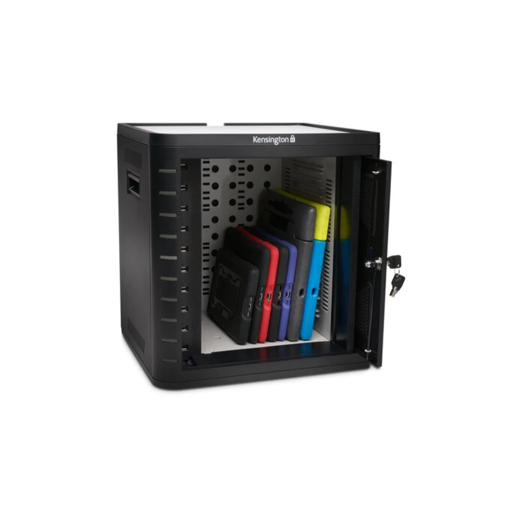 Kensington Charge & Sync Cabinet Universal Tablet. Type: Portable device management cabinet, Product colour: Black, Placement: Floor, Table. Supported portable devices: Tablet, Device connectors supported: USB, Lock type: Key. Current: 2.4 A. Width: 400 mm, Depth: 350 mm, Height: 430 mm