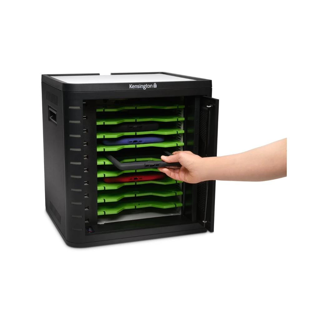 As more tablets are deployed into classrooms, businesses and retail spaces, providing a convenient and secure storage location is becoming a big need. Luckily, Kensington has the perfect answer with the new Charge & Sync Cabinet, Universal Tablet. With space for up to 10 tablets including iPads, Galaxy Tabs, Kindles and more, the cabinet is the perfect place to charge the tablets after everyone has gone home for the day so they’re powered up and ready in the morning. Plus, with adjustable drawers, each bay can accommodate tablets in a protective rugged case. Stack up to three cabinets and you’ve got storage for up to 30 tablets in one classroom. A tamper-resistant, retracting front door offers security with customized key access, and the included mounting plate or cable lock keeps the cabinet in place.