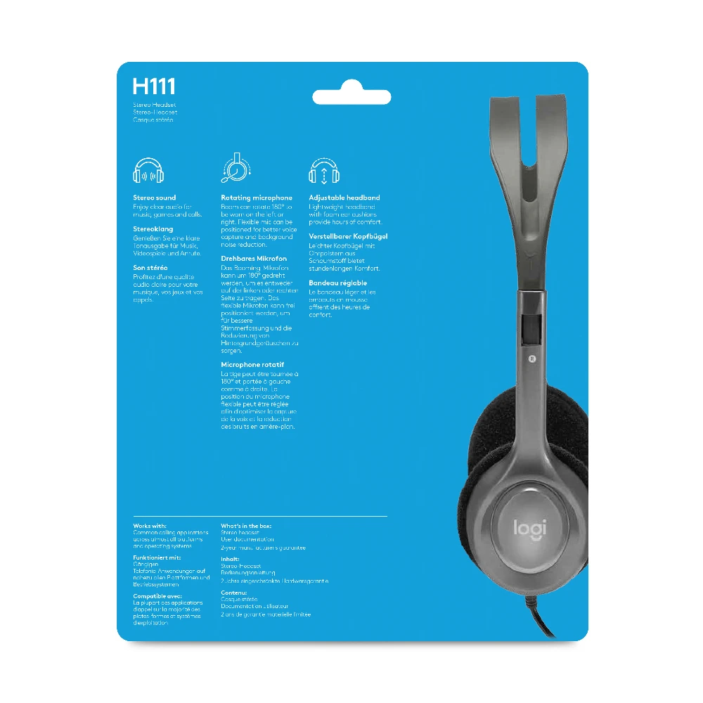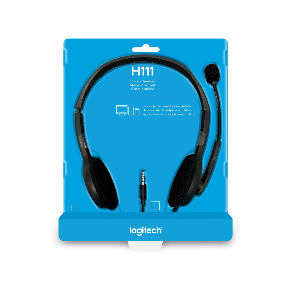 Logitech H111. Product type: Headset. Connectivity technology: Wired. Recommended usage: Office/Call center. Headphone frequency: 20 - 20000 Hz. Cable length: 2.35 m. Weight: 74 g. Product colour: Grey