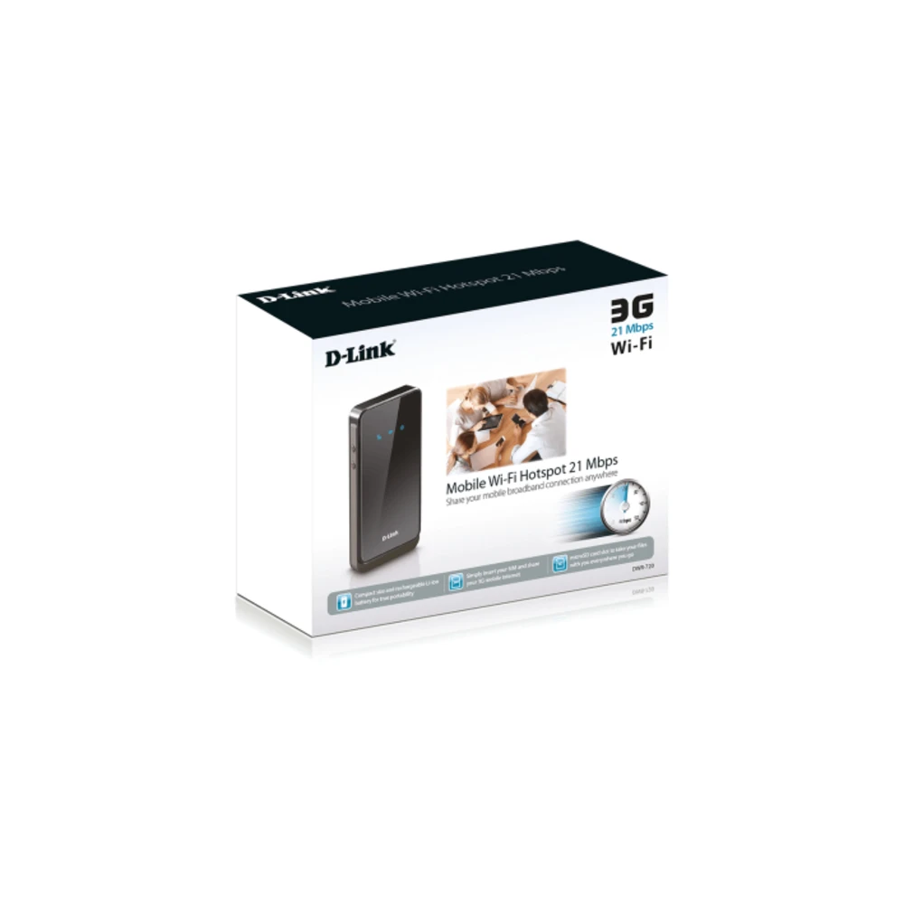 D-Link’s DWR-720 Mobile Wi-Fi Hotspot 21 Mbps1 uses your mobile 3G Internet connection to give you a simple and fast Wi-Fi network anywhere you need one. Instead of being confined to one Internet-connected device through a USB dongle, the DWR-720 allows you to create and share Wi-Fi hotspots anywhere you have a 3G signal.