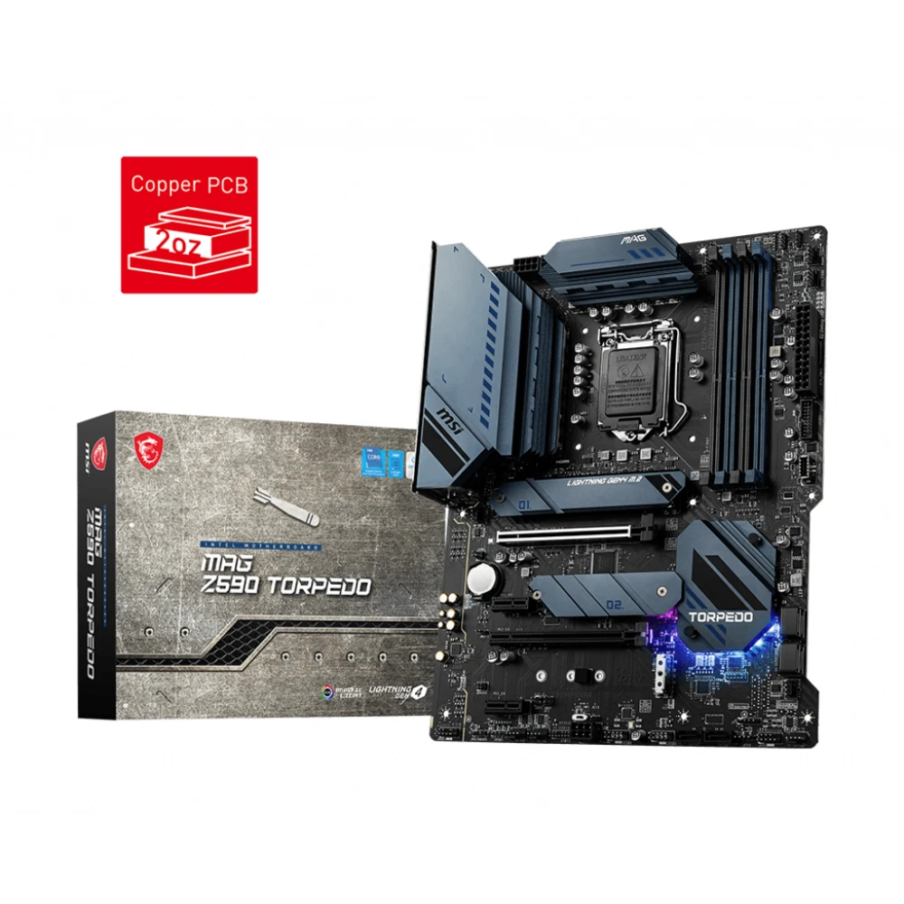 MSI MAG Z590 TORPEDO. Processor manufacturer: Intel, Processor socket: LGA 1200 (Socket H5), Compatible processor series: Intel® Celeron®, Intel® Core™ i3, Intel® Core™ i5, Intel® Core™ i7, Intel® Core™ i9, Intel Pentium G. Supported memory types: DDR4-SDRAM, Maximum internal memory: 128 GB, Memory slots type: DIMM. Supported storage drive interfaces: M.2, SATA III, Supported storage drive types: HDD & SSD, RAID levels: 0, 1, 5, 10. Parallel processing technology support: 2-Way CrossFireX, Maximum resolution: 3840 x 2160 pixels. HDMI version: 2.0b, USB connector type: USB Type-A, USB Type-C