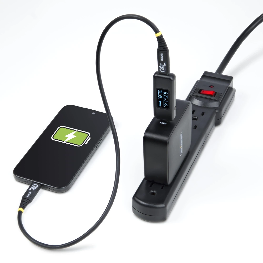 - Compact Bi-Directional USB-C Power Tester measures Voltage/Current/Wattage; Digital OLED display w/180-degree flip rotation - Portable design ideal for traveling IT Pros; Diagnose power issues between USB-C docking stations/chargers/hubs/peripherals; Test USB-C cables to ensure full power from USB-C sources - USB data pass-thru up to 10Gbps including DP Alt Mode video - 4.5V-50V/50mA-6.5A operating range and 240W USB Power Delivery 3.1 EPR; Note: Not compatible with Thunderbolt 3 devices