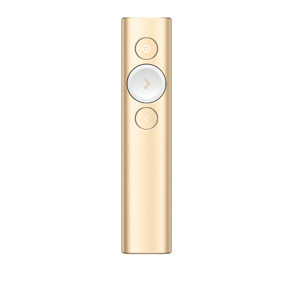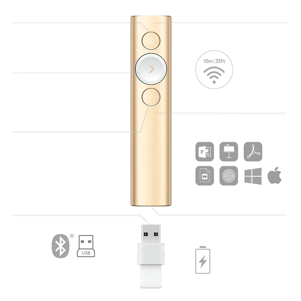 Logitech Spotlight™ Presentation Remote. Wireless receiver interface: USB, Wireless technology: Bluetooth/RF, Receiver type: Mini receiver. Product colour: Gold, Presenter functions: Remote control, Material: Aluminium, Plastic. Battery technology: Lithium Polymer (LiPo), Battery capacity: 85 mAh, Charging time: 60 min. Windows operating systems supported: Windows 10, Windows 11, Windows 7, Windows 8, Windows 8.1, Mac operating systems supported: Mac OS X 10.10 Yosemite, Mac OS X 10.11 El Capitan, Mac OS X 10.12 Sierra, Mac OS X 10.13 High.... Receiver width: 1.72 cm, Receiver depth: 4.04 cm, Receiver height: 6.8 mm
