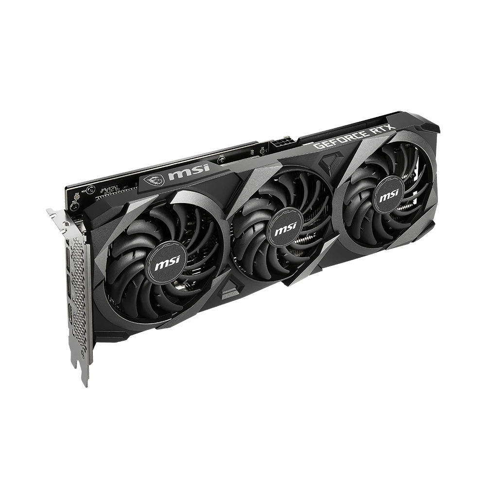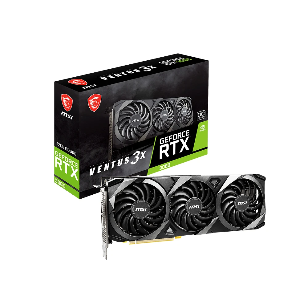 PCI Express Gen 4, CUDA 3584, 1807 MHz, 15 Gbps, 12GB GDDR6, 192-bit, 170W MSI VENTUS GeForce RTX 3060 3X 12G OC. Graphics processor family: NVIDIA, Graphics processor: GeForce RTX 3060. Discrete graphics card memory: 12 GB, Graphics card memory type: GDDR6, Memory bus: 192 bit. DirectX version: 12.0, OpenGL version: 4.6. Interface type: PCI Express 4.0. Cooling type: Active, Number of fans: 3 fan(s) The GeForce RTX™ 3060 lets you take on the latest games using the power of Ampere—NVIDIA's 2nd generation RTX architecture. Get incredible performance with enhanced Ray Tracing Cores and Tensor Cores, new streaming multiprocessors, and high-speed G6 memory. VENTUS brings a performance-focused design that maintains the essentials to accomplish any task at hand. A capable triple fan arrangement laid into a rigid industrial design lets this sharp looking graphics card fit into any build.