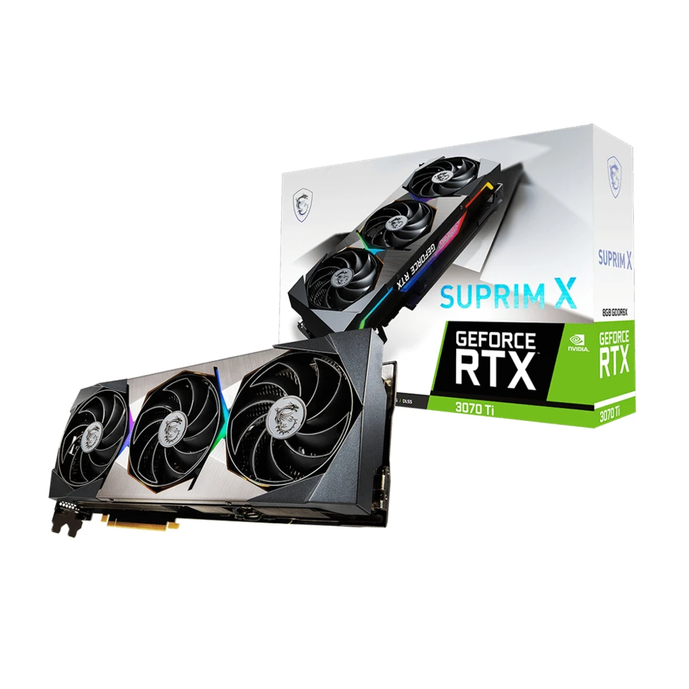 MSI SUPRIM GeForce RTX 3070 Ti X 8G. Graphics processor family: NVIDIA, Graphics processor: GeForce RTX 3070 Ti. Discrete graphics card memory: 8 GB, Graphics card memory type: GDDR6X, Memory bus: 256 bit. Maximum resolution: 7680 x 4320 pixels. DirectX version: 12.0, OpenGL version: 4.6. Interface type: PCI Express 4.0. Cooling type: Active, Number of fans: 3 fan(s), Illumination colour: Multi