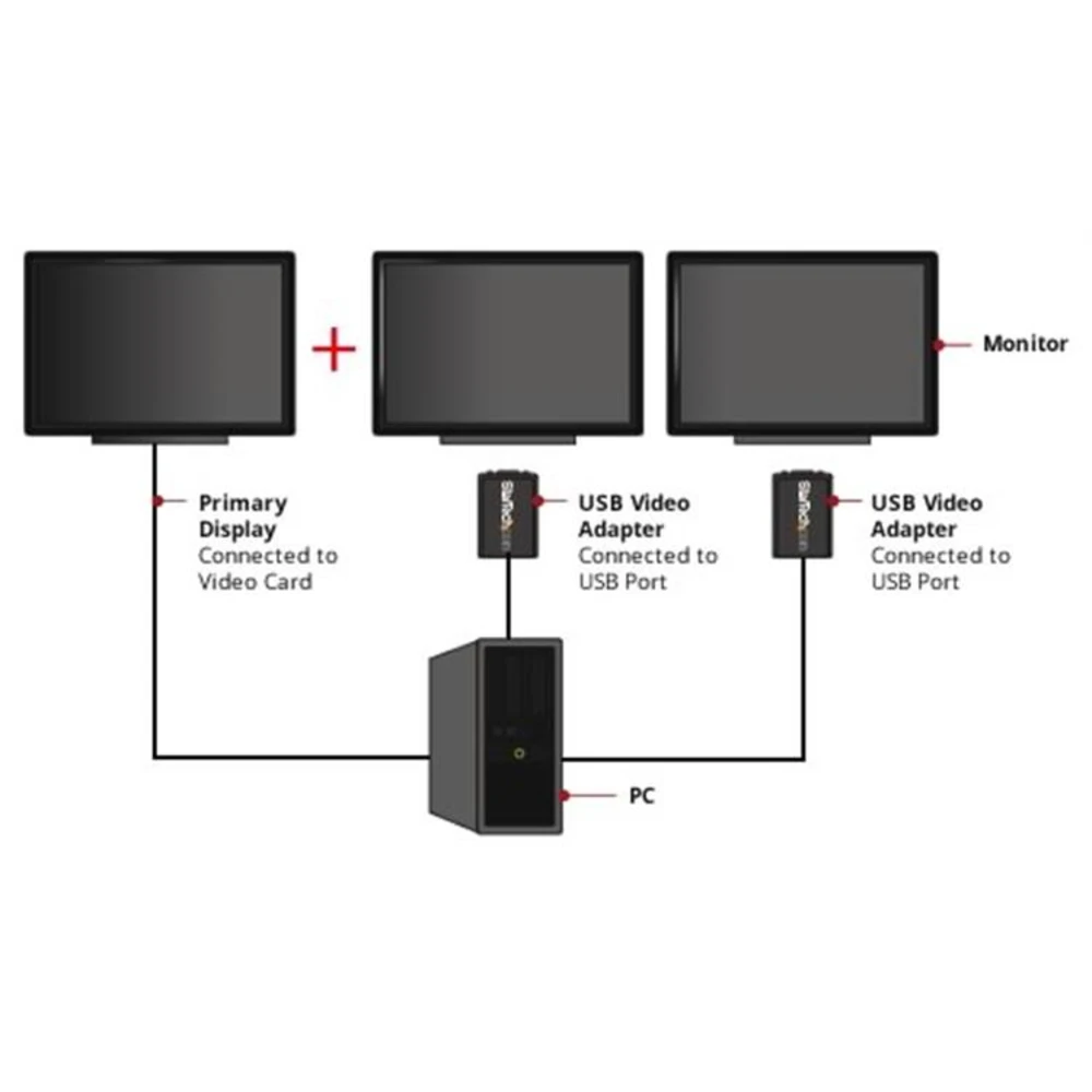 This small form factor USB video adapter can be used with up to 4 additional (5 total) USB2VGAE3 USB video adapters, creating multiple VGA connections to add displays quickly and easily - all without having to open the computer case to add extra video cards.