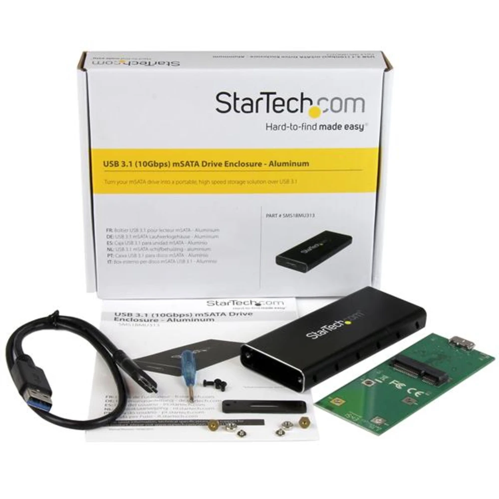StarTech.com USB 3.1 (10Gbps) mSATA Drive Enclosure - Aluminum. Product type: SSD enclosure. Number of storage drives supported: 1, Supported storage drive interfaces: mSATA, Maximum storage capacity: 1 TB. Data transfer rate: 10 Gbit/s. Product colour: Black, Silver. USB connector type: Micro-USB B