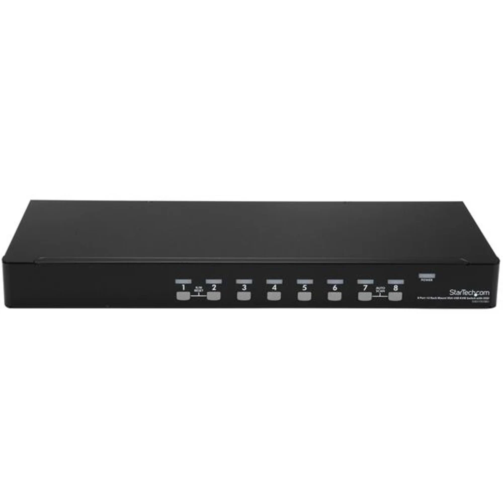 StarTech.com 8 Port 1U Rackmount USB KVM Switch Kit with OSD and Cables - Rack mount KVM - VGA KVM Switch - 8 Port KVM Switch StarTech.com 8 Port 1U Rackmount USB KVM Switch Kit with OSD and Cables. Keyboard port type: USB, Mouse port type: USB, Video port type: VGA. Maximum resolution: 1920 x 1440 pixels, Maximum analog resolution: 1920 x 1440 pixels. Product colour: Black, Rack capacity: 1U, Housing material: Steel. Input voltage: 100 - 240 V, Output voltage: 12 V, Output current: 1 A. Compliance certificates: RoHS The SV831DUSBUK 8-Port Rack Mount USB KVM Switch Kit offers a well-appointed KVM switch that includes all of the cables and accessories required to connect to 8 servers or PCs right out of the box, making setup convenient and simple.