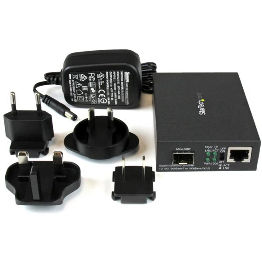 StarTech.com Gigabit Ethernet Fiber Media Converter with Open SFP Slot. Maximum data transfer rate: 1000 Mbit/s, Converter input interface: 1000Base-T, 100Base-TX, 10Base-T, Converter output interface: 1000Base-LX, 1000Base-SX. Fiber mode structure: Multi-mode, Single-mode, Mean time between failures (MTBF): 50000 h. LED indicators: Activity, Link, Power, Product colour: Black, Housing material: Steel. Fiber optic connector: SFP, Connectivity technology: Wired. Input voltage: 100 - 240 V, Input current: 1 A, Output voltage: 5 V