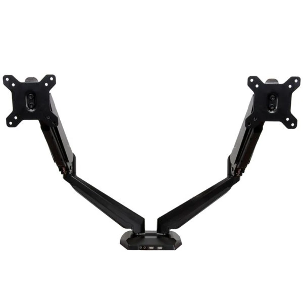 - Increase productivity by mounting two monitors up to 32" with full motion articulation - Dual Monitor Arm - Works on all VESA Mount compliant monitors including Acer/HP/Samsung - One-Touch Height Adjustment - Built-in 2-port USB and Audio Pass-Through - Monitor mount supports two monitors up to 32 in. side-by-side - Two independent articulating arms with spring-assisted height adjustment - Durable aluminum construction - Desk mountable with C-clamp