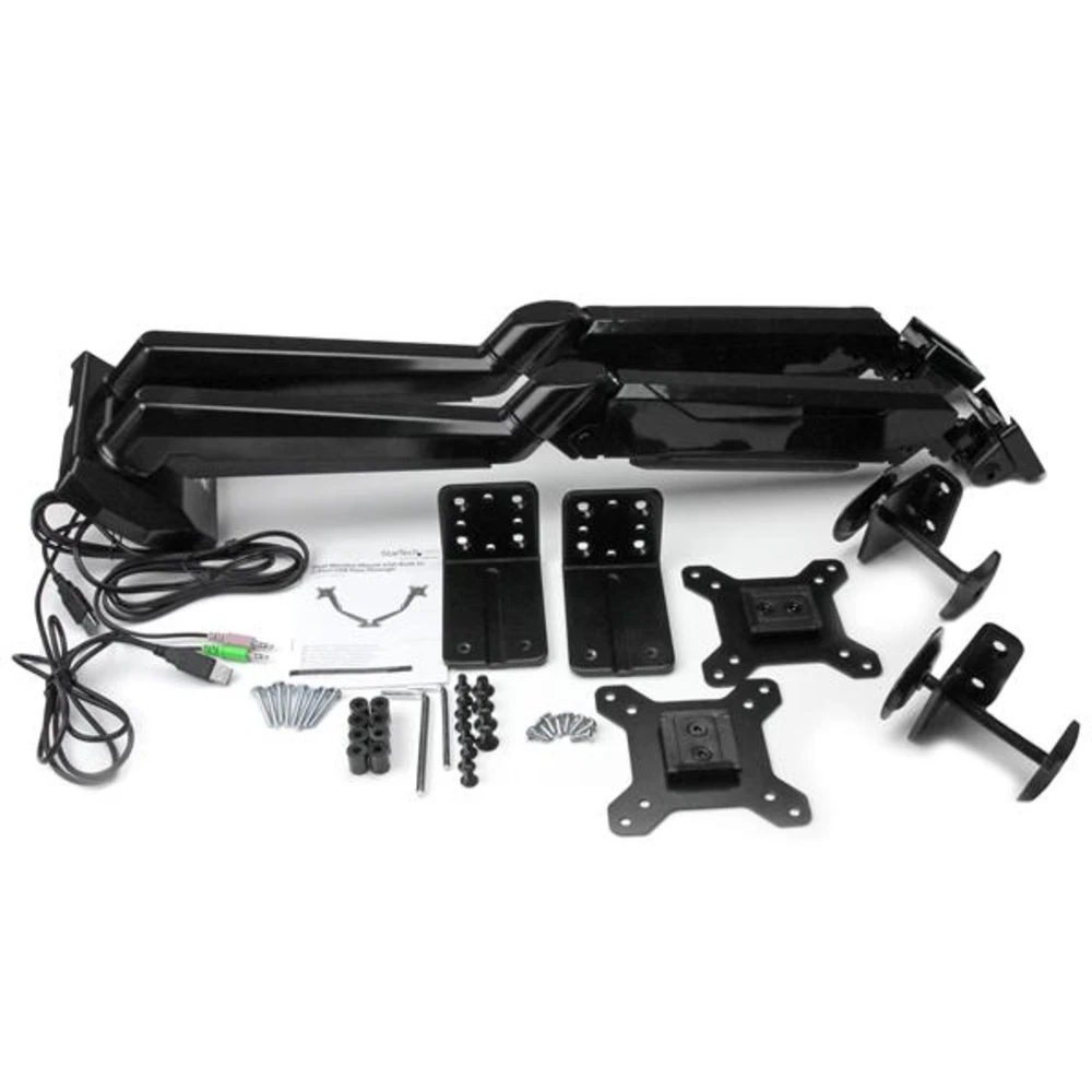 Enhance productivity and free up valuable space with the ARMSLIMDUO Dual-Monitor Arm. Two independent arms make it easy to adjust your dual-monitor setup, plus two USB pass-through ports and headset plugs provide easy accessibility to ports. Create a more ergonomic dual-monitor setup When you mount your displays on a dual-monitor arm above your desk or table surface, you can adjust your display height, position and viewing angles easily to create a more comfortable and ergonomic work environment. You also get the added benefit of reclaiming valuable workspace by clearing monitor stands off your desk, plus the cable management system keeps cables neatly tucked away. The dual-arm monitor mount holds two 12" to 32" monitors, side-by-side, with ease. Each arm supports up to 8.0 kg (17.6 lb.) of weight. Built-in USB pass-through ports and audio ports The ARMSLIMDUO gives you easy access to two USB pass-through ports and two audio ports located at the front of the base. The ports let you conveniently extend the ports on your PC or laptop, using the integrated cables. This lets you plug in your microphone, headset or USB devices, without having to reach around to access the ports on your computer. It also gives you a cleaner cable setup, which adds to a more productive, less cluttered work space. Full-motion arms with articulation and spring-assisted height adjustment The desk-mount monitor arms offer a full range of motion on several axes, letting you tilt, pan and rotate your monitors to adjust your viewing angle any time to suit your changing needs. To view longer pages or blocks of code without scrolling, the arms also support landscape-to-portrait display rotation for each monitor. The spring-assisted height adjustment makes raising or lowering your monitors effortless. You can also adjust the tension to your own preference. Durable construction and easy setup With its durable aluminum construction, the ARMSLIMDUO securely holds two monitors using a standard VESA mount. The C-clamp makes it easy to install the dual-monitor arm mount to your desk or table. The fast insert function makes it easy to attach your monitor. The ARMSLIMDUO is backed by a 2-year StarTech.com warranty and free lifetime technical support.