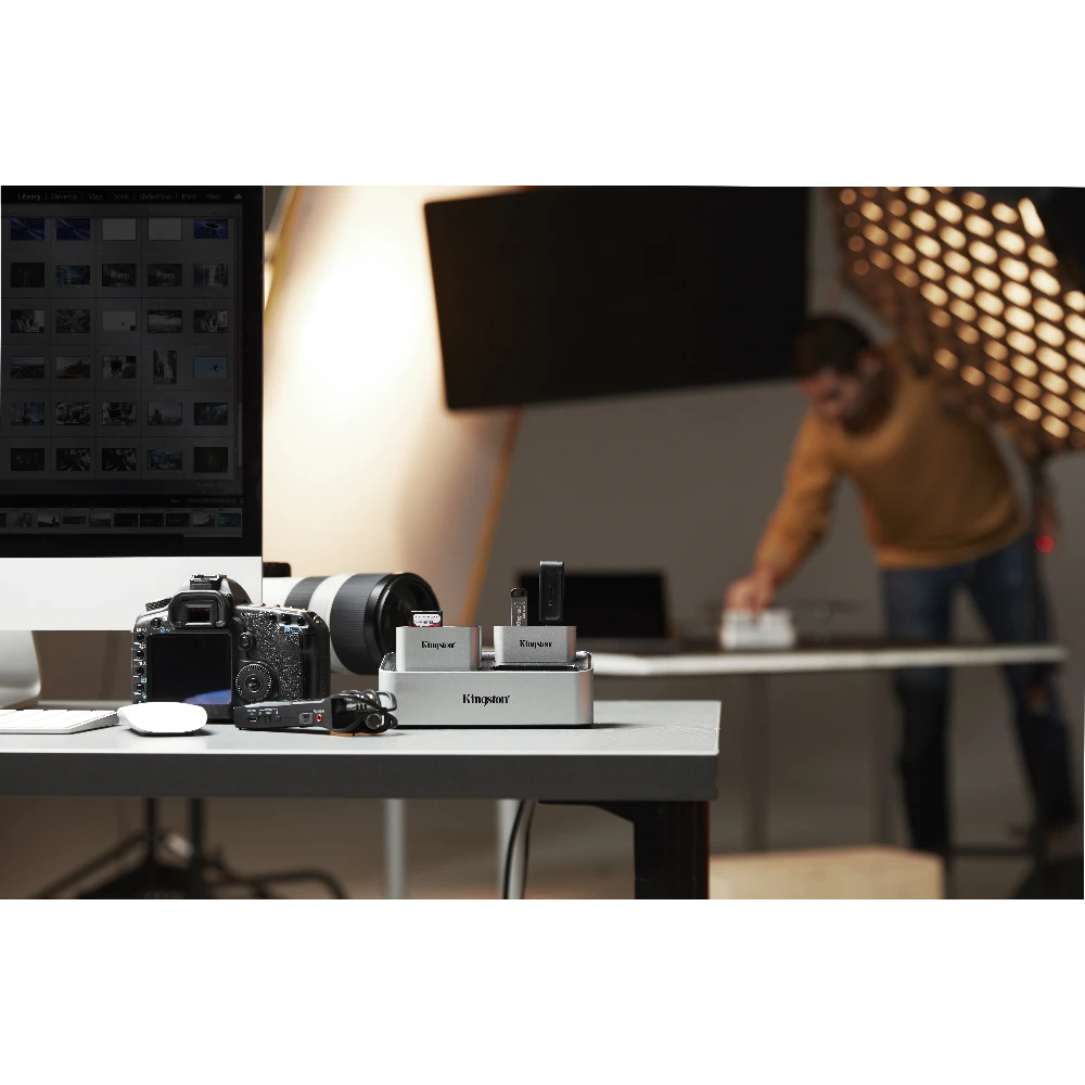 Kingston’s Workflow Station and Readers provide a flexible system to transfer video, photos and audio from multiple sources at once.* Expedite your post-production workflow and create a file offload setup that fits your needs. The Workflow Station Dock is customisable so you can use only the USB miniHub, SD readers or microSD readers that your shoot requires. Whether you’re on a 4K/8K multi-cam shoot with portable audio recorders for each host, or filming B-Roll with drones and GoPros, you can connect up to four readers to the dock simultaneously and transfer footage quickly. The Workflow Station and Readers support USB 3.2 speeds, which get you to your post-production process faster than ever. For added flexibility, the card readers can be used on the go. When you need to shoot on location, simply drop the hub or readers you need into your bag and connect them to your laptop using the included USB cable.