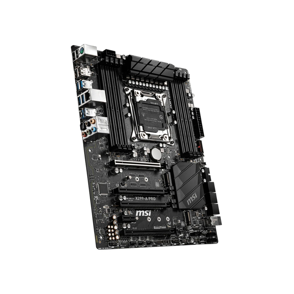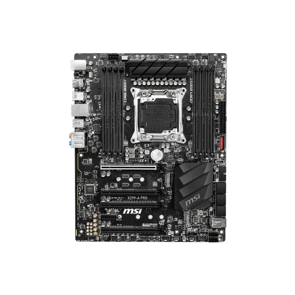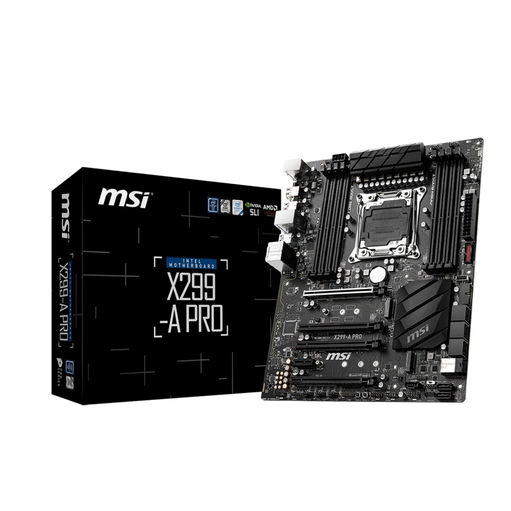 MSI X299-A PRO. Processor manufacturer: Intel, Processor socket: LGA 2066 (Socket R4), Compatible processor series: Intel® Core™ X-series. Supported memory types: DDR4-SDRAM, Maximum internal memory: 256 GB, Memory slots type: DIMM. Supported storage drive interfaces: M.2, PCI Express 3.0, SATA III, U.2, Supported storage drive types: HDD & SSD, RAID levels: 0, 1, 5, 10. Parallel processing technology support: CrossFire, SLI. Ethernet interface type: Gigabit Ethernet, LAN controller: Intel® I219-V