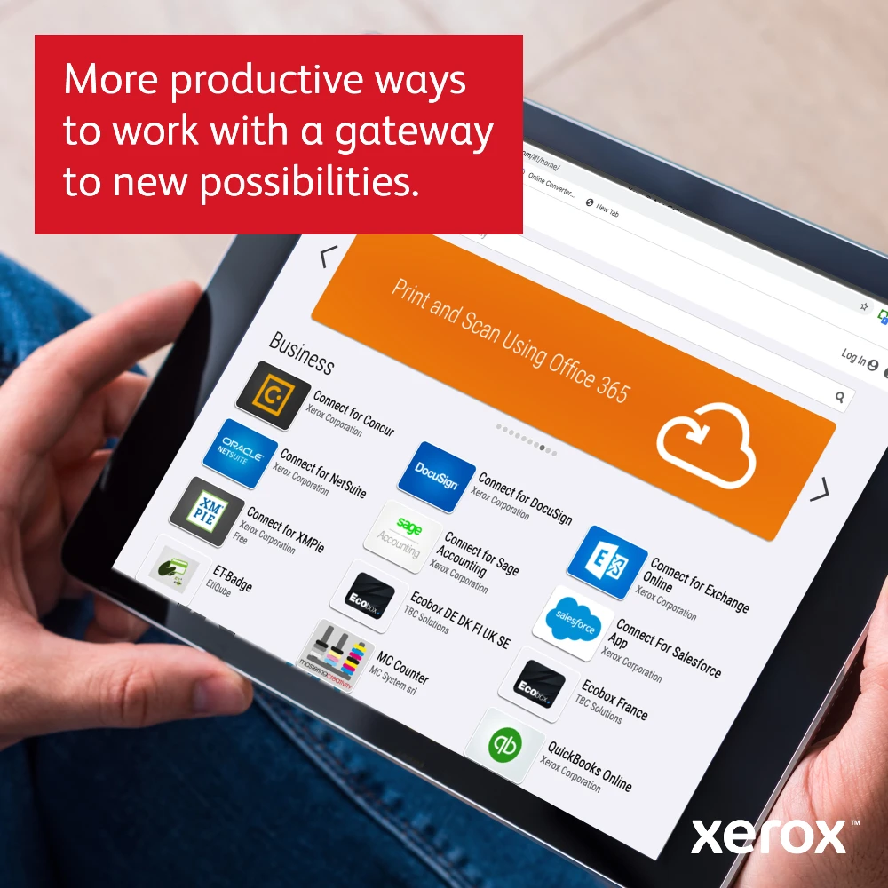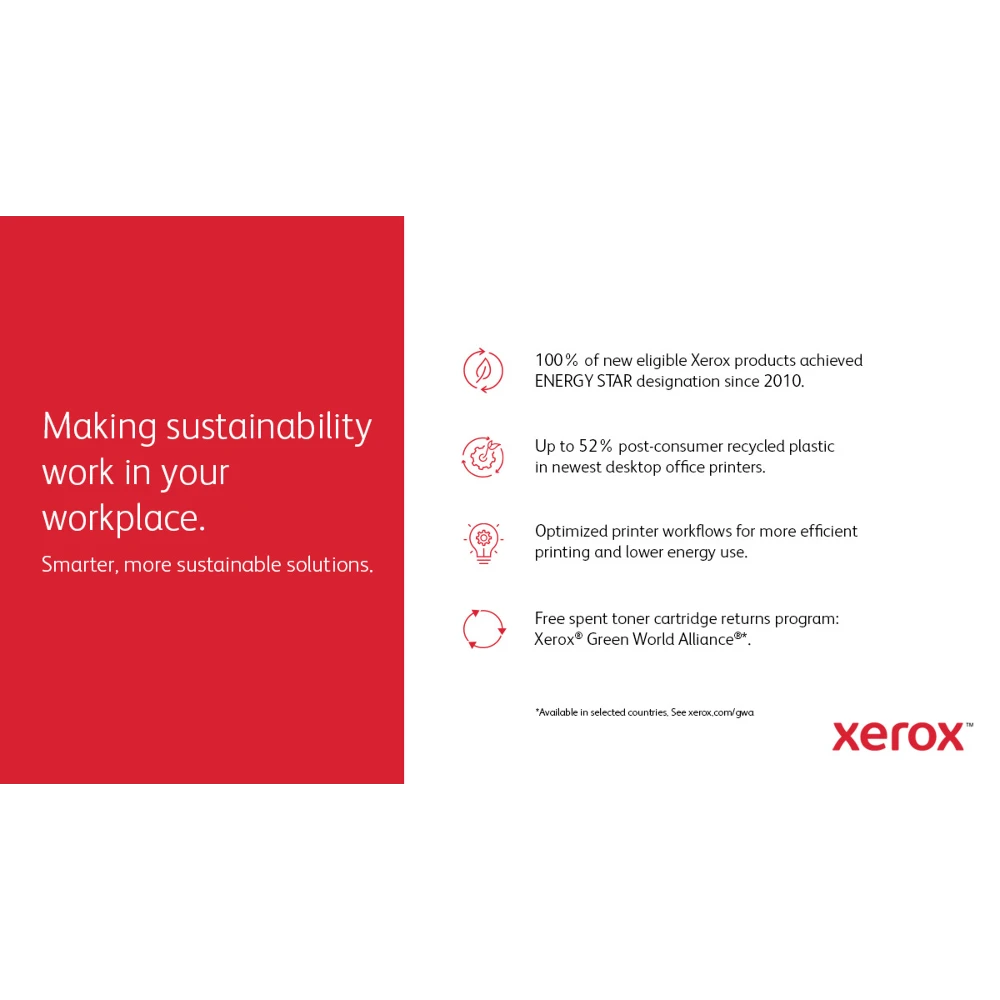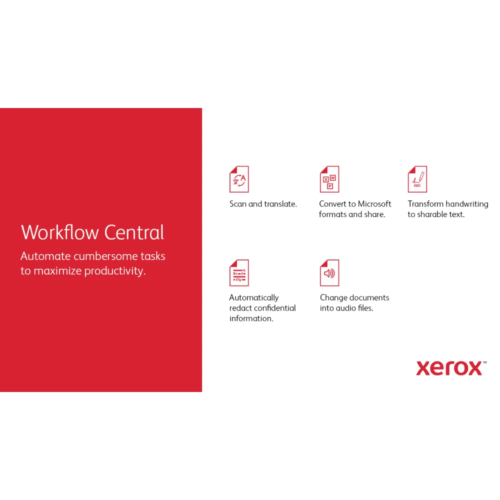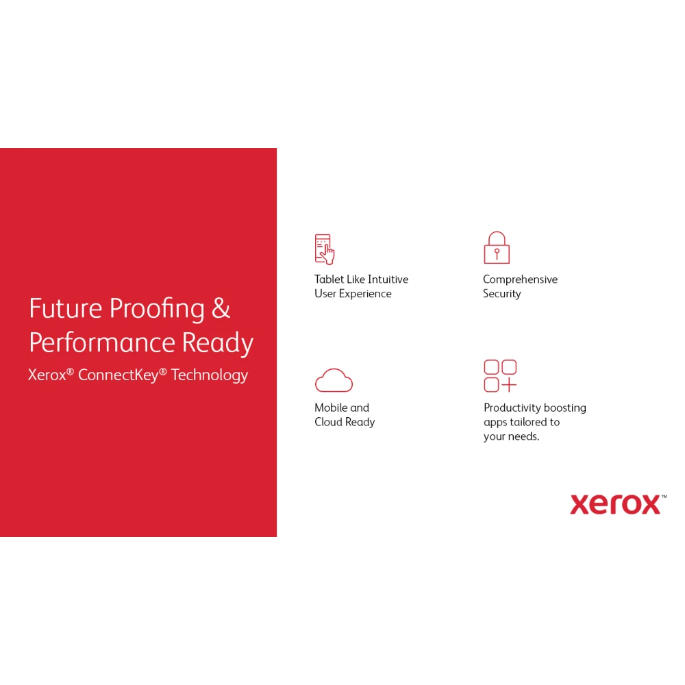 VersaLink B605 A4 56ppm Duplex Copy/Print/Scan Sold PS3 PCL5e/6 2 Trays 700 Sheets (DOES NOT SUPPORT FINISHER) Xerox VersaLink B605 A4 56ppm Duplex Copy/Print/Scan Sold PS3 PCL5e/6 2 Trays 700 Sheets (DOES NOT SUPPORT FINISHER/MAILBOX). Print technology: Laser, Printing: Mono printing, Maximum resolution: 1200 x 1200 DPI. Copying: Mono copying, Maximum copy resolution: 600 x 600 DPI. Scanning: Colour scanning, Optical scanning resolution: 600 x 600 DPI. Duplex functions: Copy, Print, Scan. Maximum ISO A-series paper size: A4. Direct printing. Product colour: Blue, White Xerox® ConnectKey® technology enabled smart Workplace Assistant