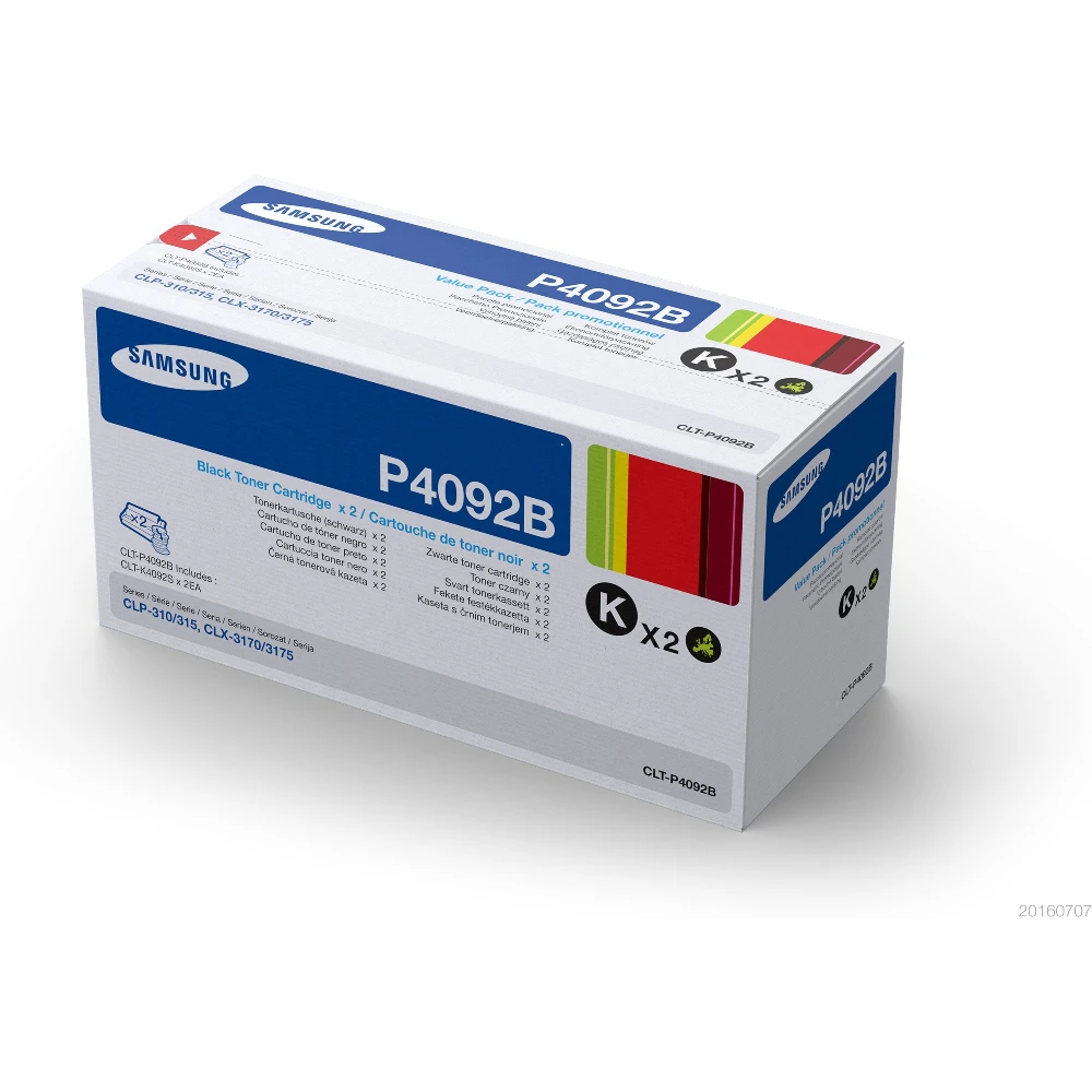 Samsung CLT-P4092B 2-pack Black Toner Cartridges Samsung CLT-P4092B 2-pack Black Toner Cartridges. Black toner page yield: 1500 pages, Printing colours: Black, Quantity per pack: 2 pc(s) Reliably print professional marketing materials Ideal for producing the sharp black text and professional-quality graphics you need?page after page?at the speeds your Samsung printer was built for.