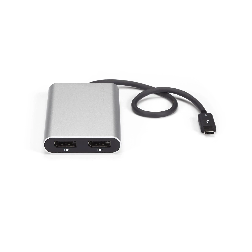 StarTech.com Thunderbolt 3 to Dual DisplayPort Adapter 4K 60Hz - Thunderbolt 3 Certified - Dual Monitor DisplayPort 1.2 Video Converter - Mac & Windows Compatible - Dual 4K DisplayPort (TB32DP2T) StarTech.com Thunderbolt 3 to Dual DisplayPort Adapter 4K 60Hz - Thunderbolt 3 Certified - Dual Monitor DisplayPort 1.2 Video Converter - Mac & Windows Compatible - Dual 4K DisplayPort. Cable length: 0.3 m, Connector 1: Thunderbolt 3, Connector 2: 2 x DisplayPort. Sustainability certificates: CE, RoHS. Weight: 93 g, Width: 60 mm, Depth: 110 mm. Package width: 145 mm, Package depth: 212 mm, Package height: 40 mm. Master (outer) case width: 440 mm, Master (outer) case length: 420 mm, Master (outer) case height: 320 mm - Thunderbolt 3 to 2x DisplayPort 1.2 4K 60Hz or Single 5K 60Hz/7.1 Audio/HDCP 2.2/1.4/TB3 Certified - Bus-powered dual monitor DP video adapter (4K 60Hz/1440p/1080p) - Supports MacBook Pro/Air (extended dual displays on MacBooks w/Intel/M1 MAX/M1 PRO prcoessor & single display w/older M1 chip), Lenovo ThinkPad X1 Carbon T Series/Dell XPS Latitude Precision/HP EliteBook ZBook; Auto setup macOS/Windows - Tested w/DP displays incl LG Samsung Sony Dell ASUS ACER - Active conversion to HDMI/VGA/DVI Run the most resource-demanding applications on two 4K 60Hz displays, using your Mac or PCThis high-performance Thunderbolt? 3 adapter lets you add two 4K 60Hz DisplayPort monitors to your Windows? or Mac computer through a single Thunderbolt 3 port, or it can be used to connect your Thunderbolt 3 port to a 5K 60Hz display using two DP cables.The Thunderbolt video adapter is compatible with computer systems that support Thunderbolt 3, such as models of MacBook Pro, Dell? Precision, and Dell XPS. Thunderbolt 3 is a protocol that uses the USB-C? connector, but your computer system must support Thunderbolt 3 in order for the adapter to function as expected. If you connect the adapter to a USB-C port that does not support Thunderbolt 3, the adapter will not function.Connect two UHD 4K displays to your computer at 60Hz resolutionWith an unprecedented 40Gbps of throughput, Thunderbolt 3 enables you to achieve the previously impossible feat of using a single port on your laptop to output dual 4K resolution at 60Hz to two independent displays. This performance enables you to run the most resource-demanding applications imaginable on two independent displays. You can output independent content to each display at resolutions of up to 4096 x 2160p (60Hz), which is perfect for editing 4K video or performing other Ultra HD tasks such as creating CAD drawings or reviewing medical imagery.Connect a 5K display to your computer at 60Hz resolutionFor added versatility, the Thunderbolt 3 adapter can be used to connect two DisplayPort channels to a single 5K display. Using a Thunderbolt 3 adapter is the only way to connect a 5K display to computers that don?t have multiple DP or Thunderbolt 3 ports, such as your Dell Precision 15 3000 Series workstation.Supports dual 4K displays to work more efficientlyFunctioning as an external 2-port graphics adapter with audio support, this is a compact and convenient alternative to a laptop dock when you don?t need full docking capability.With two UHD 4K displays, you can work more efficiently from your laptop, so you can accomplish more in the same amount of time. Plus, with each display delivering 4K performance, you can have four times the screen space compared to 1080p. Creative professionals can be more productive with the freedom to edit 4K video on one display while previewing raw video playback on the second 4K display.Won't drain system resourcesThis adapter helps to keep your system running at peak performance. Unlike USB external video solutions, Thunderbolt 3 lets you run Ultra HD 4K resolution at 60Hz on both displays without draining system resources.Because it?s backward compatible with your high-definition 1080p displays, this is a great accessory for home, office or other desktop workspace applications.The TB32DP2T is backed by a 2-year StarTech.com warranty and free lifetime technical support.Your computer?s Thunderbolt 3 ports might not function properly until you update one or more of the following on your computer:? BIOS? Thunderbolt firmware? Thunderbolt 3 controller drivers? Thunderbolt 3 softwareThe required updates will vary depending on your computer.For an up-to-date list of affected computers and instructions, visit http://thunderbolttechnology.net/updates. If your manufacturer isn?t listed on the Thunderbolt website, contact your manufacturer.Notes:?If you're using a video adapter to connect this device to a monitor other than DisplayPort, such as HDMI or VGA, an active video adapter is required.?In order to connect to two displays at 4K 60Hz, your computer system must have a fully enabled Thunderbolt 3 port that supports up to 40Gbps or the host must support dual displays over Thunderbolt 3.The StarTech.com Advantage