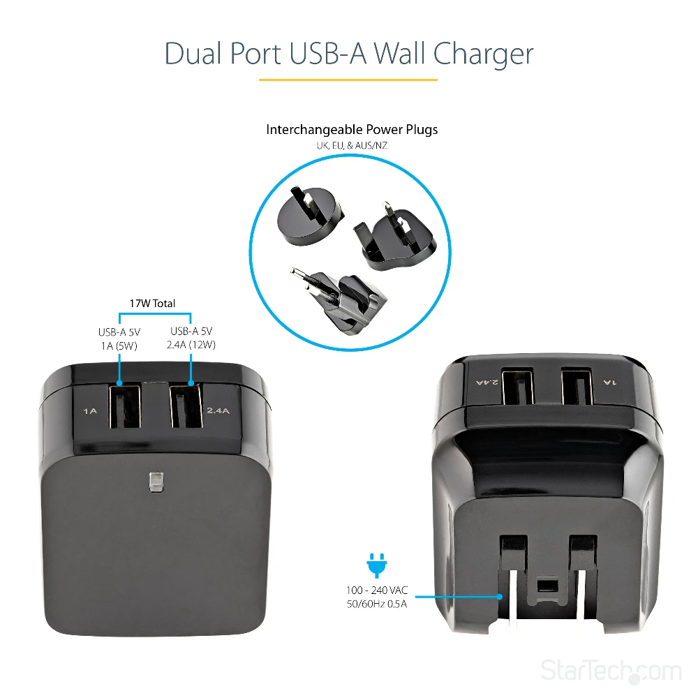 StarTech.com Dual Port USB Wall Charger ? High Power 17 Watt / 3.4 Amp (1A & 2.4A) ? Travel Charger (International) 110V/220V