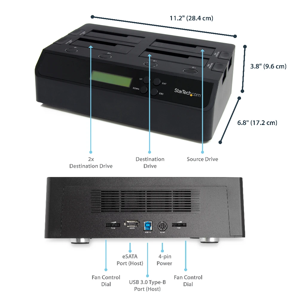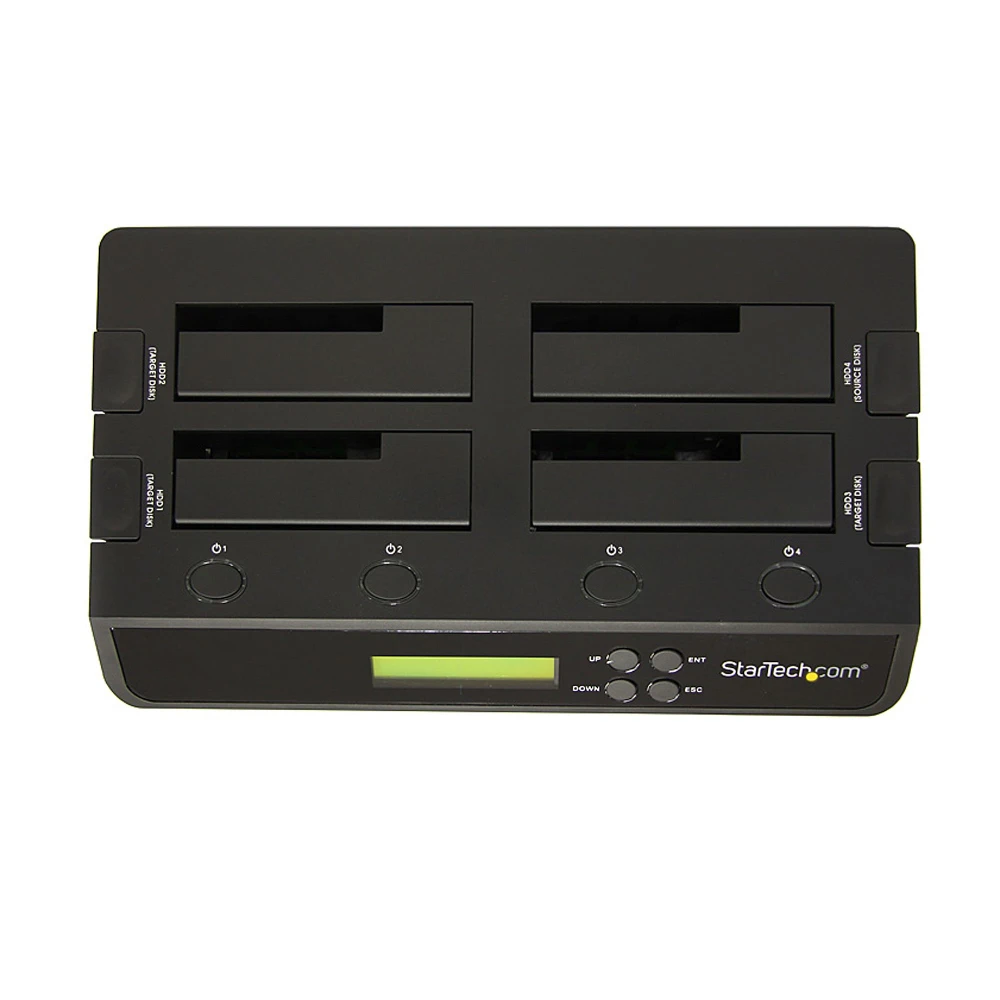 StarTech.com 4 Bay USB 3.0 eSATA to SATA Standalone 1:3 HDD Hard Drive Duplicator Dock. Supported HDD sizes: 2.5,3.5", Supported HDD interfaces: Serial ATA, Serial ATA II. Compatible operating systems: Windows 2000/ XP(32/64-bit)/ Server 2003(32/64-bit)/ Vista(32/64-bit)/ 7(32/64-bit)/ Server 2008.... Power consumption (typical): 78 W, AC input voltage: 110-240 V, Output voltage: 12 V. Dimensions (WxDxH): 285 x 170 x 94 mm, Weight: 1.1 kg. Display: LCD
