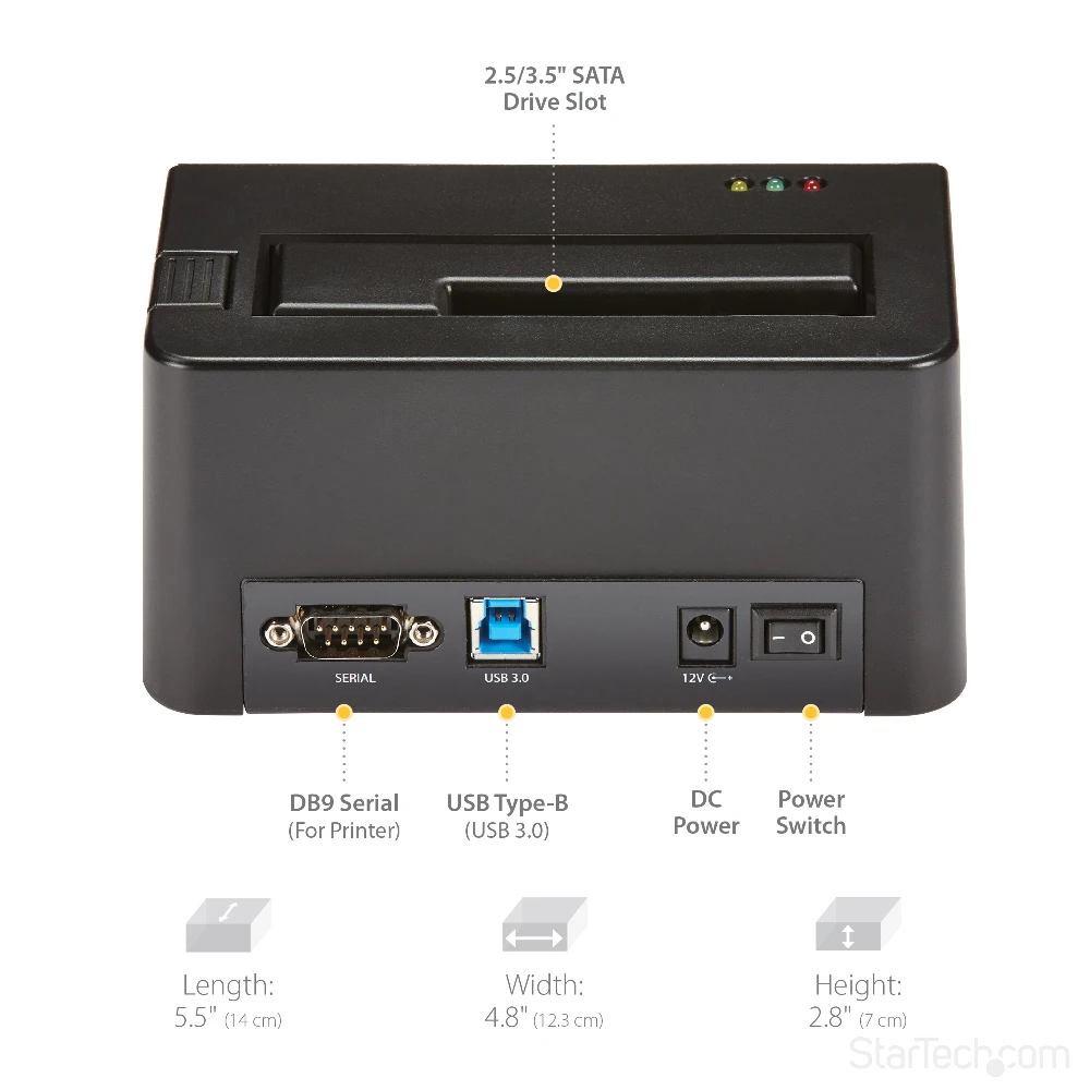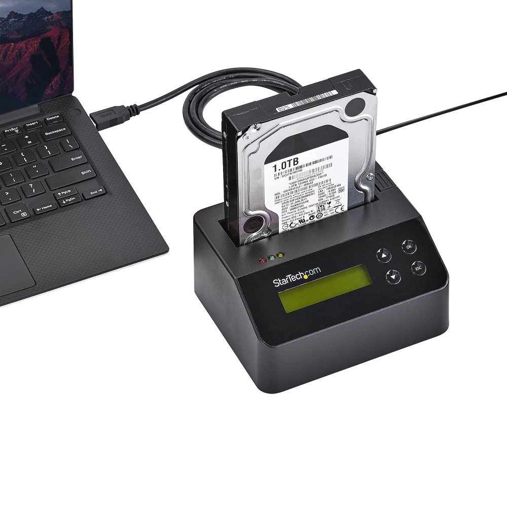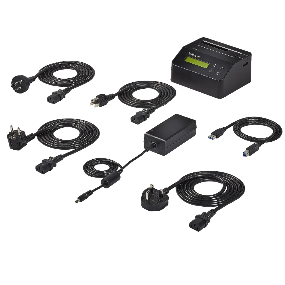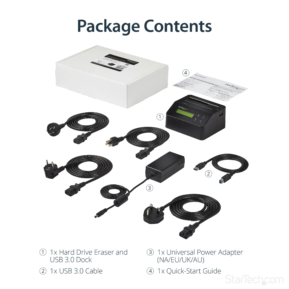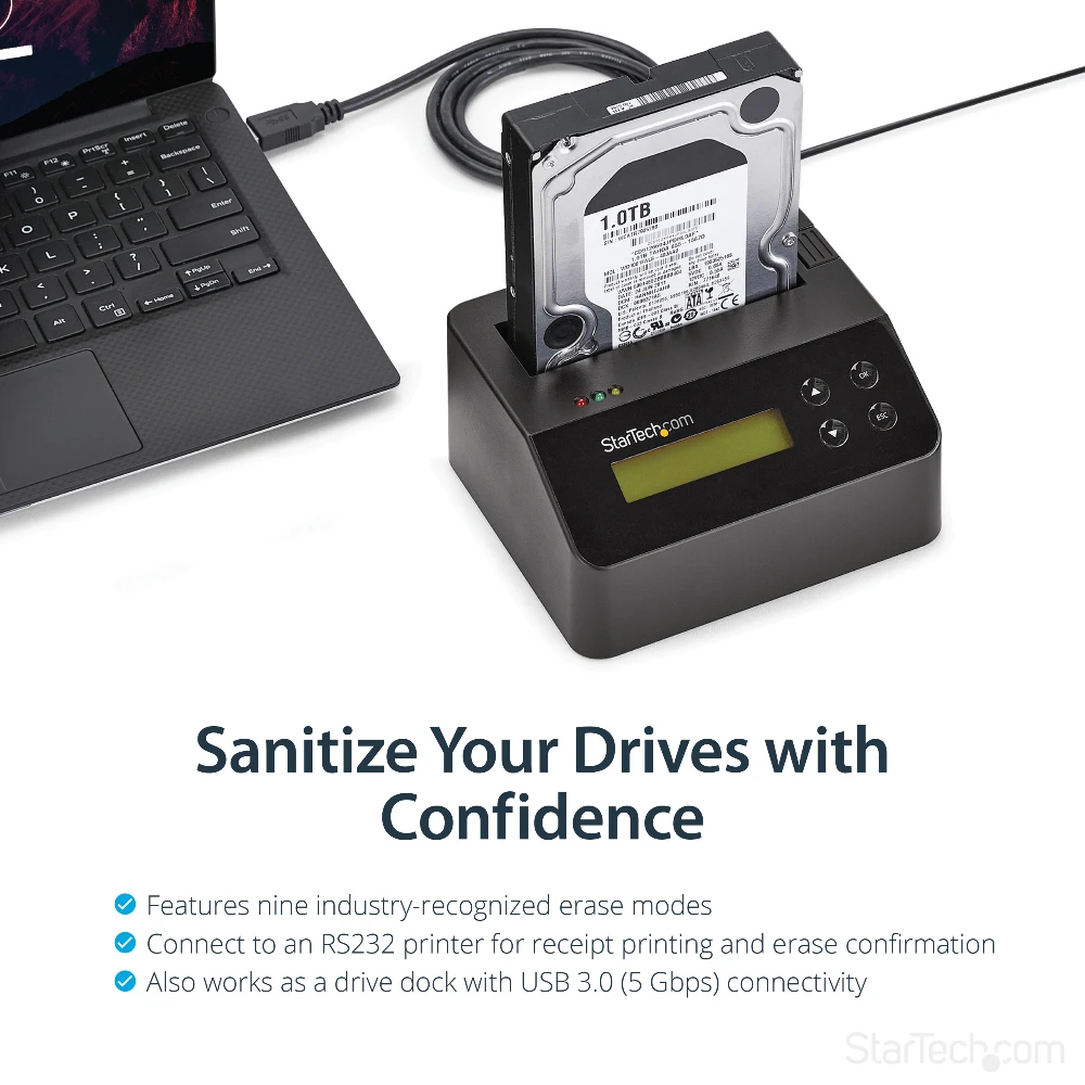 StarTech.com Single Bay Hard Drive Eraser, Standalone HDD/SSD Sanitizer, USB 3.0 to SATA II (3 Gbps), 9 Erase Modes, LCD Display, Secure Erase, Hard Disk Sanitizer, DB-9 Printer Port, TAA (SDOCK1EU3P) StarTech.com Single Bay Hard Drive Eraser, Standalone HDD/SSD Sanitizer, USB 3.0 to SATA II (3 Gbps), 9 Erase Modes, LCD Display, Secure Erase Hard Disk Sanitizer Dock, DB-9 Printer Port, TAA Compliant. HDD interface: Serial ATA, Serial ATA II, SSD interface: IDE, M.2, Docking station supported HDD size: 2.5,3.5". Power: 60 W, AC input voltage: 100 - 240 V, Input current: 1.4 A. Width: 123 mm, Depth: 140 mm, Height: 70 mm. Products per master (outer) case: 7 pc(s), Master (outer) case length: 469 mm, Master (outer) case width: 396 mm. Package width: 189 mm, Package depth: 376 mm, Package height: 91 mm - Single-bay hard drive eraser works as standalone disk sanitizer (no PC required) or a USB to SATA adapter for a single 2.5/3.5" drive - 9 erase modes including Quick Erase, Single/3/7 Pass Overwrite, Secure and Enhanced Secure Erase (meets NIST SP 800-88 Rev 1 clear/purge) - Supports 2.5/3.5" SATA Drives of any capacity. OS Independent - SATA II (3 Gbps) | USB 3.2 Gen 1 (5 Gbps) | LCD Display | LED Indicator Lights | TAA Compliant - Includes 3ft USB-A Cable and Universal Power Adapter Single Bay Hard Drive Eraser, Standalone HDD/SSD Sanitizer, USB 3.0 to SATAMake the most of your SATA drives. This standalone eraser dock lets you erase your 2.5? and 3.5? solid-state drives or hard drives without connecting to a host computer, making it easy to re-use or re-purpose your SATA drive. For added peace of mind, the dock offers a printed confirmation when data has been securely erased.The eraser dock also gives you a single-bay dock for your SATA drive with fast USB 3.0 performance, also known as USB 3.1 Gen 1 (5 Gbps).Industry-recognized erase modesUsing industry-recognized erase modes, you can rest assured that the standalone eraser securely cleans, erases or sanitizes the data from your 2.5? or 3.5? SSD or HDD.The eraser dock supports nine erase modes including Quick Erase, Single and Multi-pass Overwrites, Custom Erase, Secure Erase and Enhanced Secure Erase. The Multi-pass Overwrite (3-Pass Full Disk Overwrite) erase procedures meet the requirements of DoD (5220.22-M) standards.Wipe sensitive data securely, confirmed with a printed receiptThe eraser dock lets you connect to an RS232 serial printer to print a record of the erase procedure and confirm that the erase has been successfully completed. This feature is ideal for IT technicians, system administrators or any departments needing confirmation when erasing sensitive or confidential information. For your reference, the printed receipt clearly shows you the time and date of erase, as well as the erase mode used.This drive eraser ensures data is purged (a secure erase) which is required by government agencies and organizations who have strict guidelines on deleting data. Purging is a very secure method of erasing data from your storage device which complies with the NIST 800-88 Rev. 1 media sanitation standard established by the National Institute of Standards and Technology.Easy drive management and wide compatibilityFor IT technicians or business professionals who need to check files or test different hard drives, the dock lets you hot-swap drives in and out as needed. The dock features a single SATA bay with a top-loading design for easy access to your drives, which makes it easy to quickly back-up or transfer data to a hard drive or solid-state drive.With support for SATA I and II and large capacity drives (tested up to 6TB), this docking station is compatible with virtually any 2.5? and 3.5? SATA SSD or HDD drive.The eraser dock also works with mSATA drives and M.2 drives using a compatible StarTech.com adapter:mSATA drives: Use StarTech.com adapter SAT32MSAT257 mSATA SSD to 2.5in SATA Adapter ConverterM.2 drives: Use StarTech.com adapter SAT32M225 M.2 NGFF SSD to 2.5in SATA Adapter ConverterHassle-free set-up and a compact designThe eraser dock is OS independent, which ensures a quick and easy setup. Its compact design and small footprint allows it to tuck easily into your workspace.The TAA compliant SDOCK1EU3P is backed by a StarTech.com 2-year warranty and free lifetime technical support.The StarTech.com Advantage