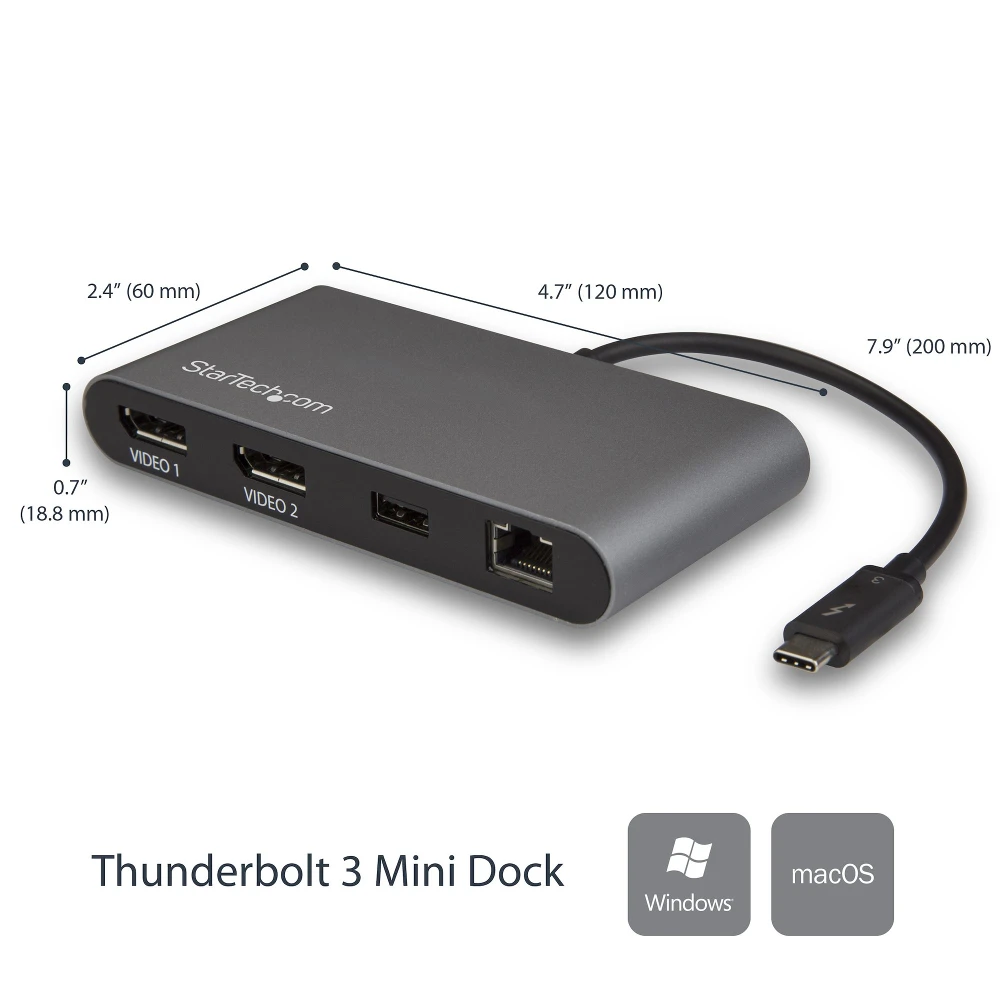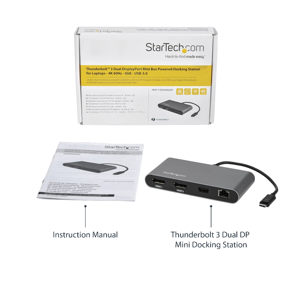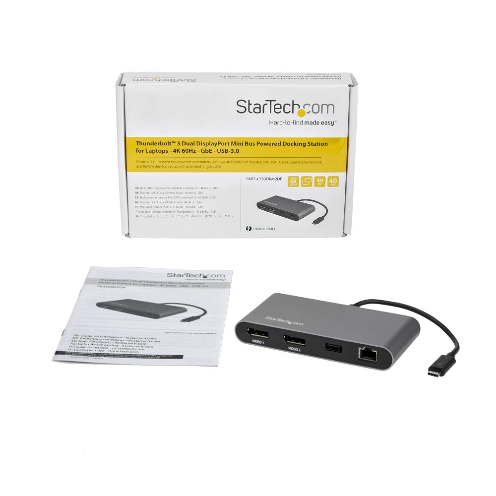 Laptop Docking Station | Mac & Windows® | Bus-Powered | 1x USB-AThe bus-powered Thunderbolt 3™ docking station connects to dual 4K DisplayPort displays, Gigabit Ethernet and a USB 3.0 (Type-A) port. Compatible with macOS and Windows®, it’s the ideal accessory for your Thunderbolt 3 laptop and for flexible setup, the attached USB-C cable has an extended length of (7.9 in. | 20 cm).Create a Dual-4K 60Hz WorkstationGreat for editing 4K video or other Ultra HD tasks, this portable dual DisplayPort docking station supports 40Gbps of throughput and 4K resolution at 60Hz on two DisplayPort monitors, through a single Thunderbolt 3 port.Connect your laptop to:• 2x 4K DisplayPort displays (up to 4096 x 2160p @ 60Hz)OR• 1x 5K display (5120 × 2880 @ 60Hz)Easy Installation & DeploymentSimply connect the TB3 dock to your laptop with included TB3 cable and start working immediately. No time-consuming driver installations are required.The Ports You Need MostTo enhance your productivity, the Gigabit Ethernet port (with PXE Boot and Wake-on-LAN support) ensures reliable wired network access. A USB 3.0 Type-A port, with ample space around it, lets you connect a USB device, like a flash drive, for easy file access.Enhance Productivity and Device Management with the StarTech.com Connectivity Tools ApplicationDeveloped to improve performance and security, StarTech.com Connectivity Tools is the only software suite on the market that works with a wide range of IT connectivity accessories. The software suite includes:•Advanced Windows Layout Utility : To setup and save custom windows layouts.•Mac Address Pass-Through Utility : To improve network security.•USB Event Monitoring Utility : To track and log connected USB devices•Wi-Fi Auto Switch Utility : Enabling users to quickly access faster network speeds via wired LAN.For more information and to download the StarTech.com Connectivity Tools application, please visit: www.StarTech.com/Connectivity-ToolsThe TB3DKM2DP is Thunderbolt Certified, and backed by a StarTech.com 3-year warranty and free lifetime technical support.The StarTech.com Advantage
