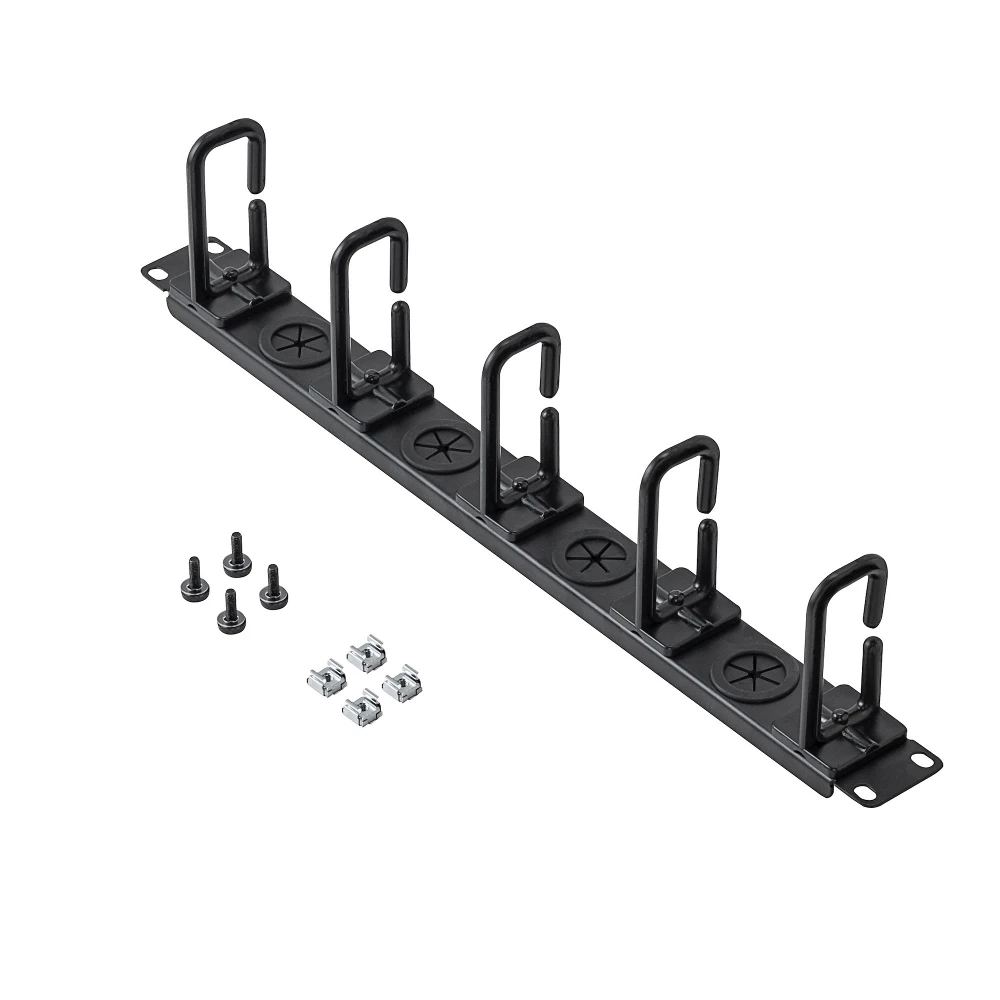 - 1U 19" cable management organizer for routing of cables; Horizontal low profile design - D Ring Hook Passthrough holes (with inner/outer diameters of 1.18/1.02in [26/30mm]) provide clean exit and keep bundles manageable - Fits into 19" 2 or 4 post server/network rack; Mounted w/incl. M5 cage nuts/screws - TECH SPECS: 1U 19" Rack cable/wire/cord organizer | 4 x cable pass-through | 5x routing loops | Steel construction | 4" depth w/hooks installed | EIA/ECA-310-E compliant