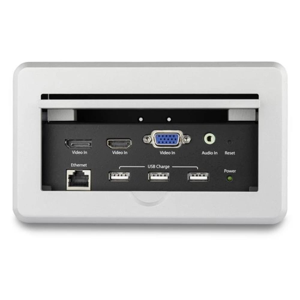 The boardroom interconnect box has an aluminum finish that complements your space. The hideaway panel eliminates clutter by discreetly covering the connection ports when they’re not in use.