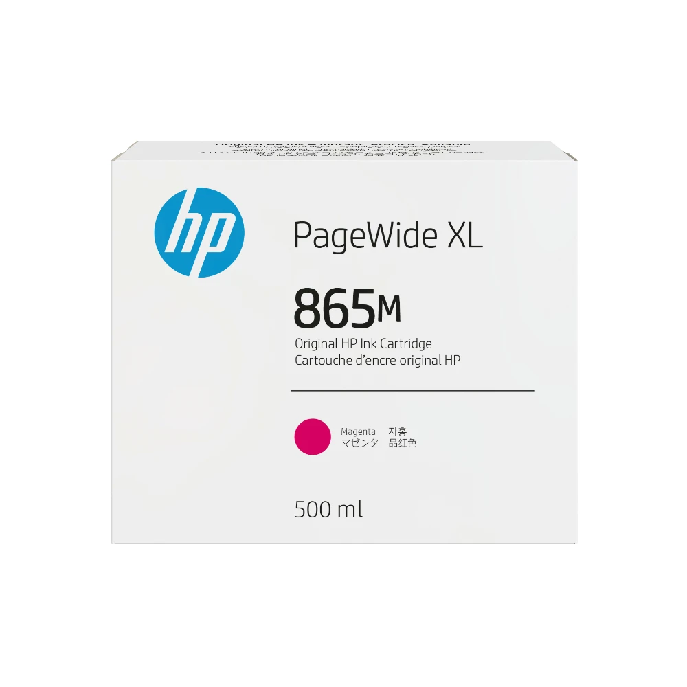 865M 500-ml Magenta PageWide XL Ink Cartridge HP 865M 500-ml Magenta PageWide XL Ink Cartridge. Colour ink type: Dye-based ink, Cartridge capacity: Standard Yield, Black ink volume: 0 ml, Supply type: Single pack, Colour ink volume: 500 ml, Printing colours: Magenta, Quantity per pack: 1 pc(s) Excel and grow with document quality, color Ideal for high-volume production of technical documents as well as GIS map and short-term retail poster applications.