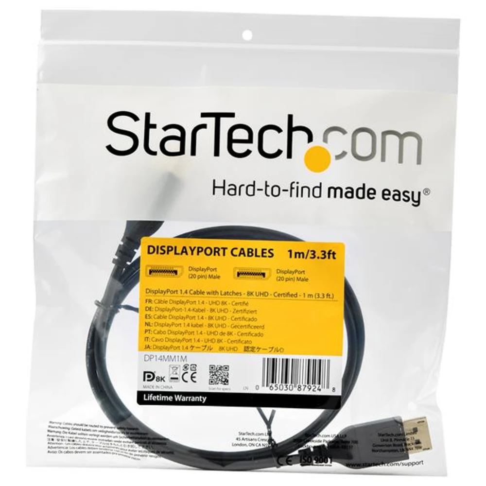 StarTech.com 1 m VESA Certified DisplayPort 1.4 Cable - 8K 60Hz HBR3 HDR - 3 ft Super UHD DisplayPort to DisplayPort Monitor Cord - Ultra HD 4K 120Hz DP 1.4 Slim Video Cable M/M DP Connector. Cable length: 1 m, Connector 1: DisplayPort, Connector 2: DisplayPort. Weight: 59 g, Quantity per pack: 1 pc(s), Package width: 200 mm. Master (outer) case width: 335 mm, Master (outer) case length: 400 mm, Master (outer) case height: 265 mm